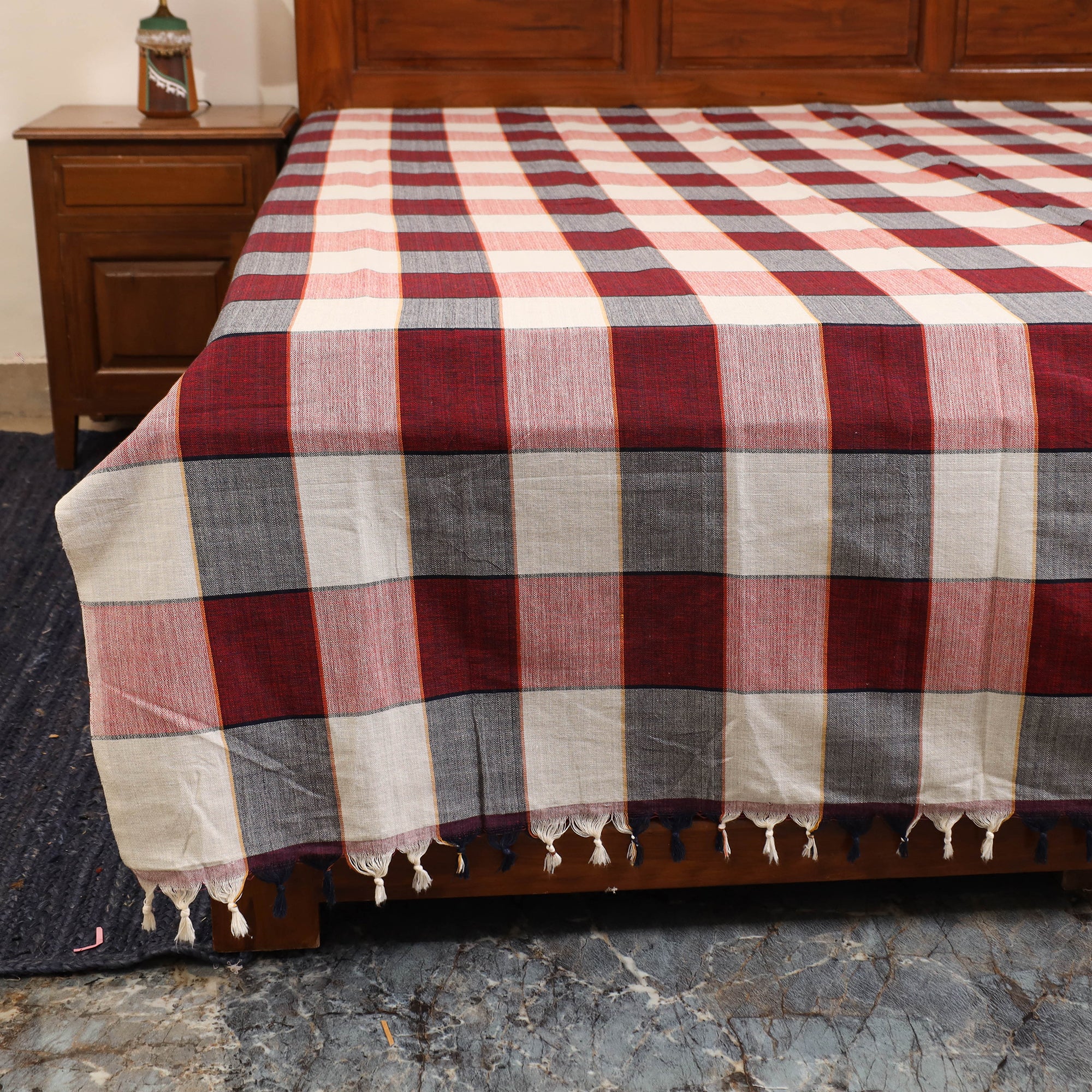 This beautifully woven red handloom bed sheet blends comfort with charm for your bedroom. Crafted from pure cotton, it ensures lasting durability and a gentle texture for restful sleep. The handloom weaving process gives each piece a unique character, reflecting the timeless traditions of skilled Indian artisans.
