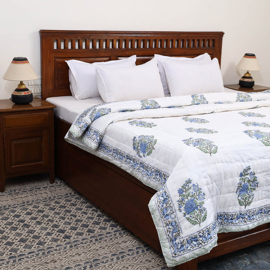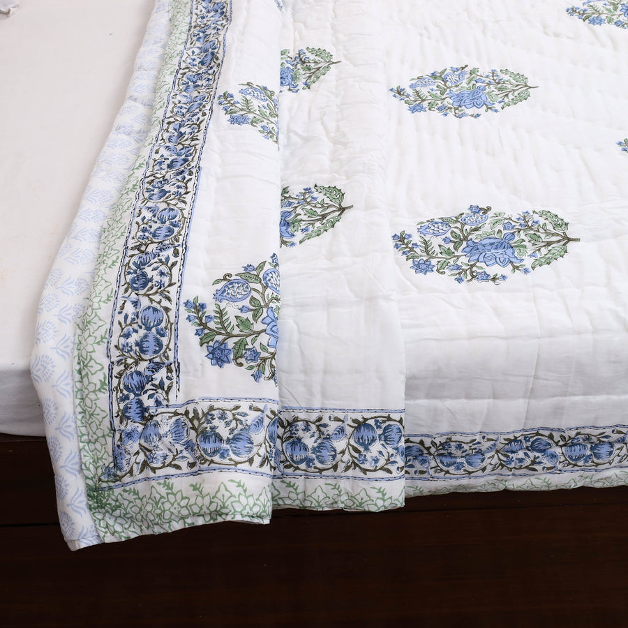 Wrap yourself in the unmatched softness of a handcrafted double - reversible sanganeri block print cotton quilt. Designed with timeless block prints from Sanganer, Rajasthan, these quilts feature reversible designs. Made with VAT dyes, ensuring vibrant, fade-free patterns, they are lightweight yet cozy, perfect for chilly nights or everyday use. Each piece reflects India’s rich cultural heritage and artisan dedication. Shop now and bring an eco-friendly, artisanal touch to your home.