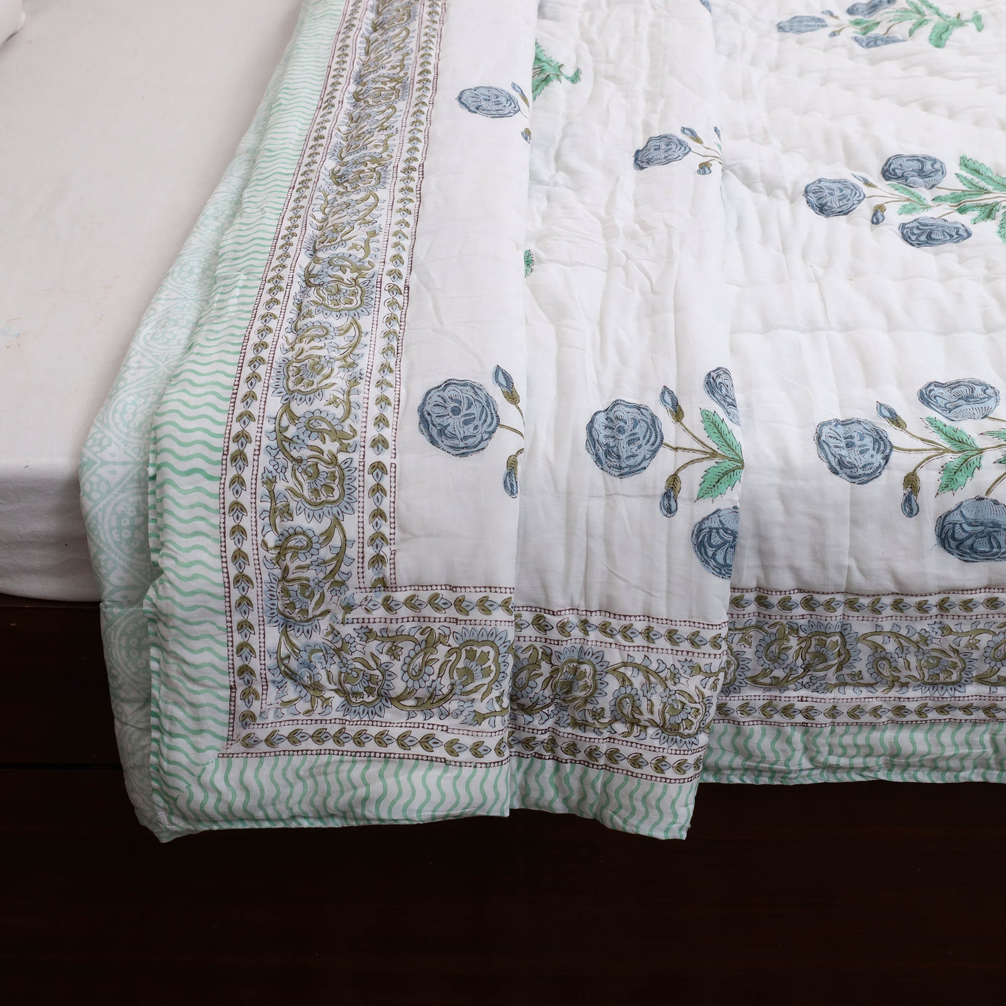 Wrap yourself in the unmatched softness of a handcrafted double - reversible sanganeri block print cotton quilt. Designed with timeless block prints from Sanganer, Rajasthan, these quilts feature reversible designs. Made with VAT dyes, ensuring vibrant, fade-free patterns, they are lightweight yet cozy, perfect for chilly nights or everyday use. Each piece reflects India’s rich cultural heritage and artisan dedication. Shop now and bring an eco-friendly, artisanal touch to your home.