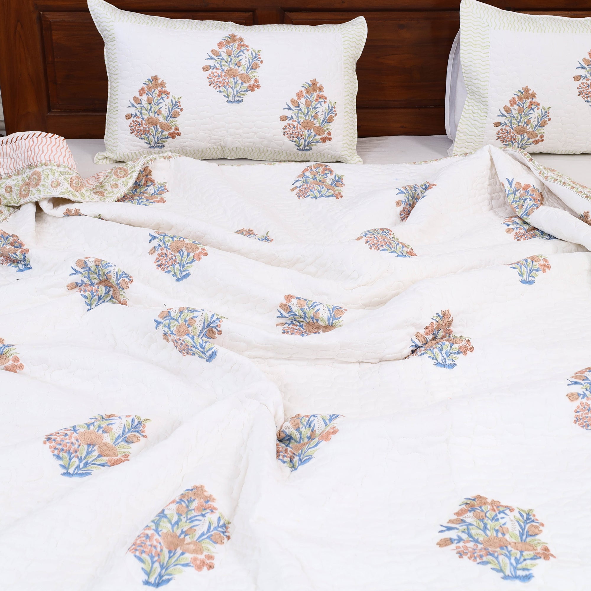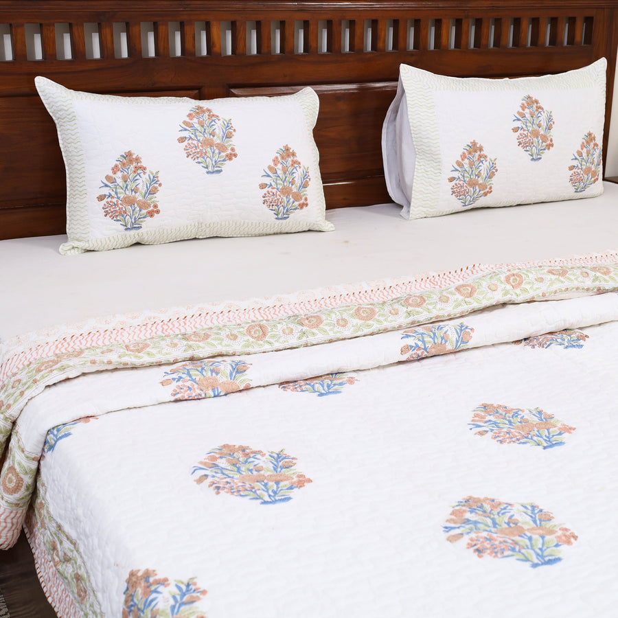 Wrap yourself in the unmatched softness of a handcrafted double - reversible sanganeri block print cotton quilt set. Designed with timeless block prints from Sanganer, Rajasthan, these quilts feature reversible designs. Made with VAT dyes, ensuring vibrant, fade-free patterns, they are lightweight yet cozy, perfect for chilly nights or everyday use. Each piece reflects India’s rich cultural heritage and artisan dedication. Shop now and bring an eco-friendly, artisanal touch to your home.