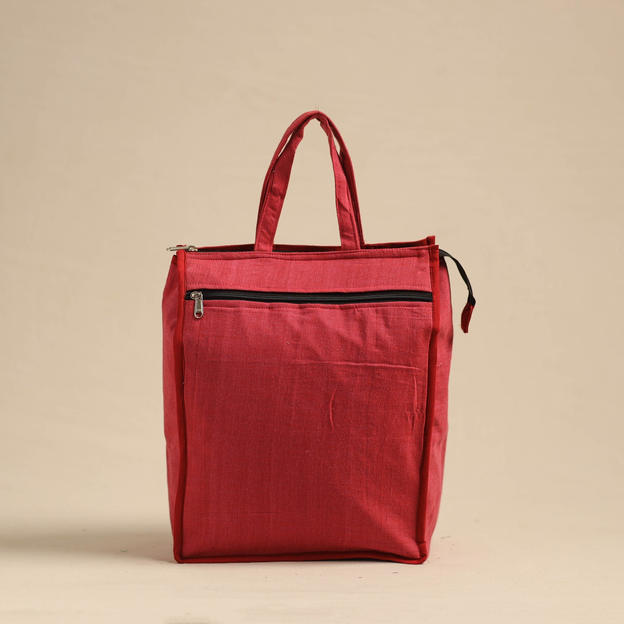 Upgrade your shopping style with this red eco-friendly handmade cotton handbag for women. Crafted from Indian handmade cotton fabrics with care, this bag is lightweight and perfect for daily essentials. A sturdy handle and outer zipper pocket add practicality and convenience, making it ideal for trips to the store, picnics, or casual outings. Embrace a sustainable, handmade choice that supports local artisans while adding style to everyday life.