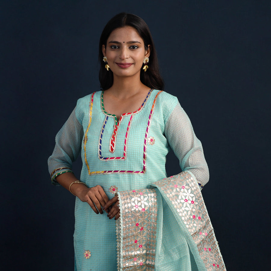 Step into timeless elegance with our blue elegant gota work silk kota doria kurta set, featuring a silk gota work kurta, a lightweight dupatta, and comfortable cotton palazzo. This kurta has one side pocket, and the elasticized waist palazzo ensures a great fit, while the two side pockets add functionality. Handcrafted in Rajasthan, this ensemble reflects the rich heritage of Kota's weaving traditions. The Doria threads create unique check patterns, offering a sheer, breezy texture perfect for festive occasions.