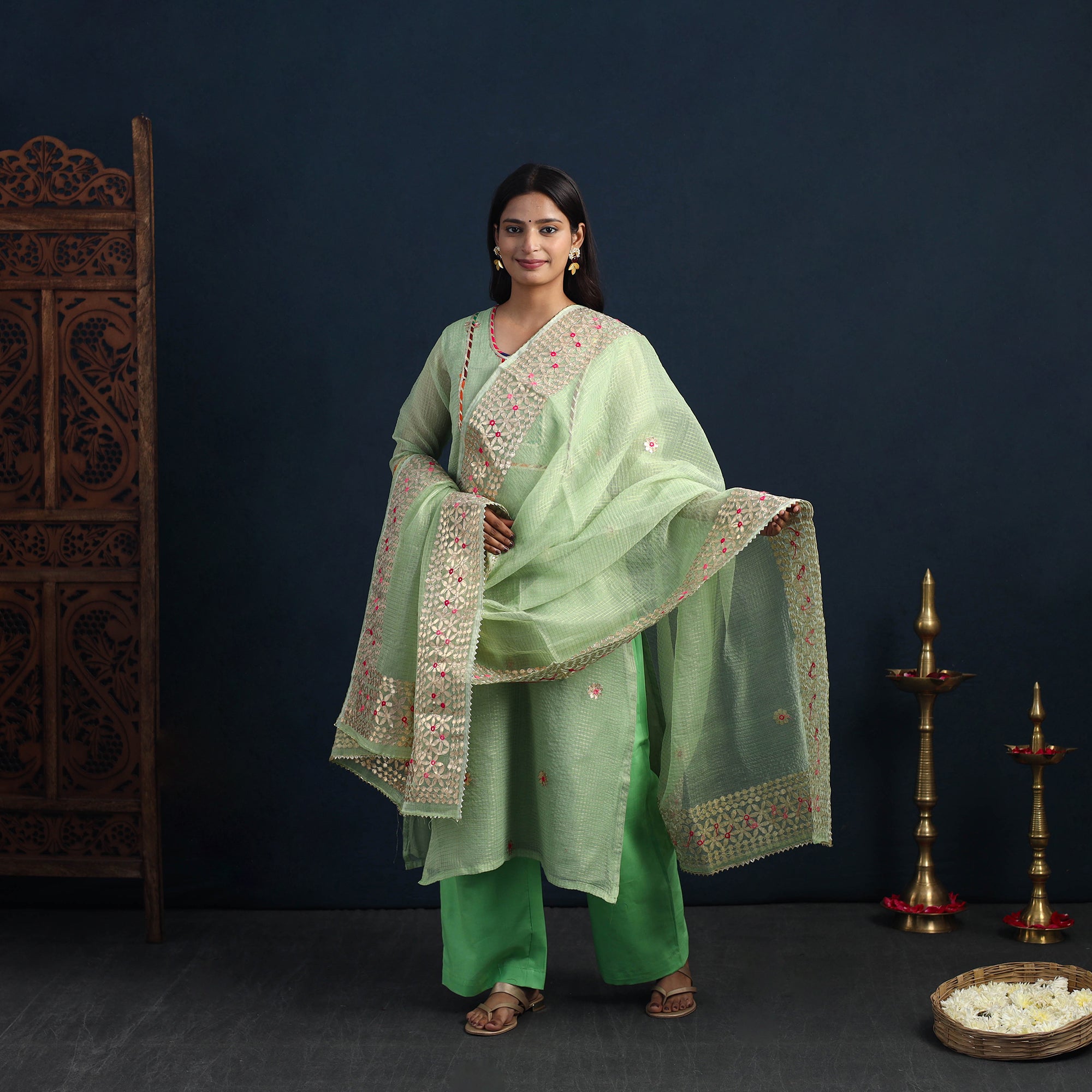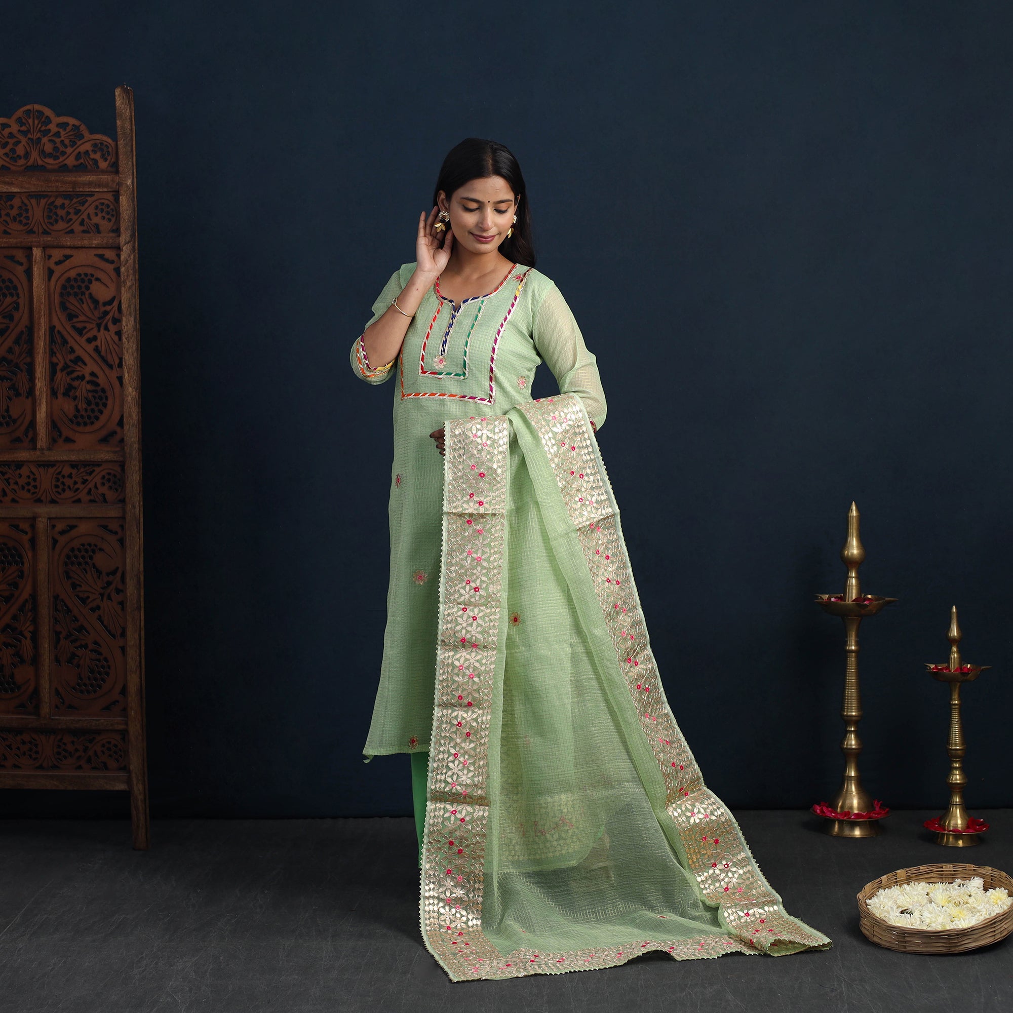 Step into timeless elegance with our green elegant gota work silk kota doria kurta set, featuring a silk gota work kurta, a lightweight dupatta, and comfortable cotton palazzo. This kurta has one side pocket, and the elasticized waist palazzo ensures a great fit, while the two side pockets add functionality. Handcrafted in Rajasthan, this ensemble reflects the rich heritage of Kota's weaving traditions. The Doria threads create unique check patterns, offering a sheer, breezy texture perfect for festive occasions.