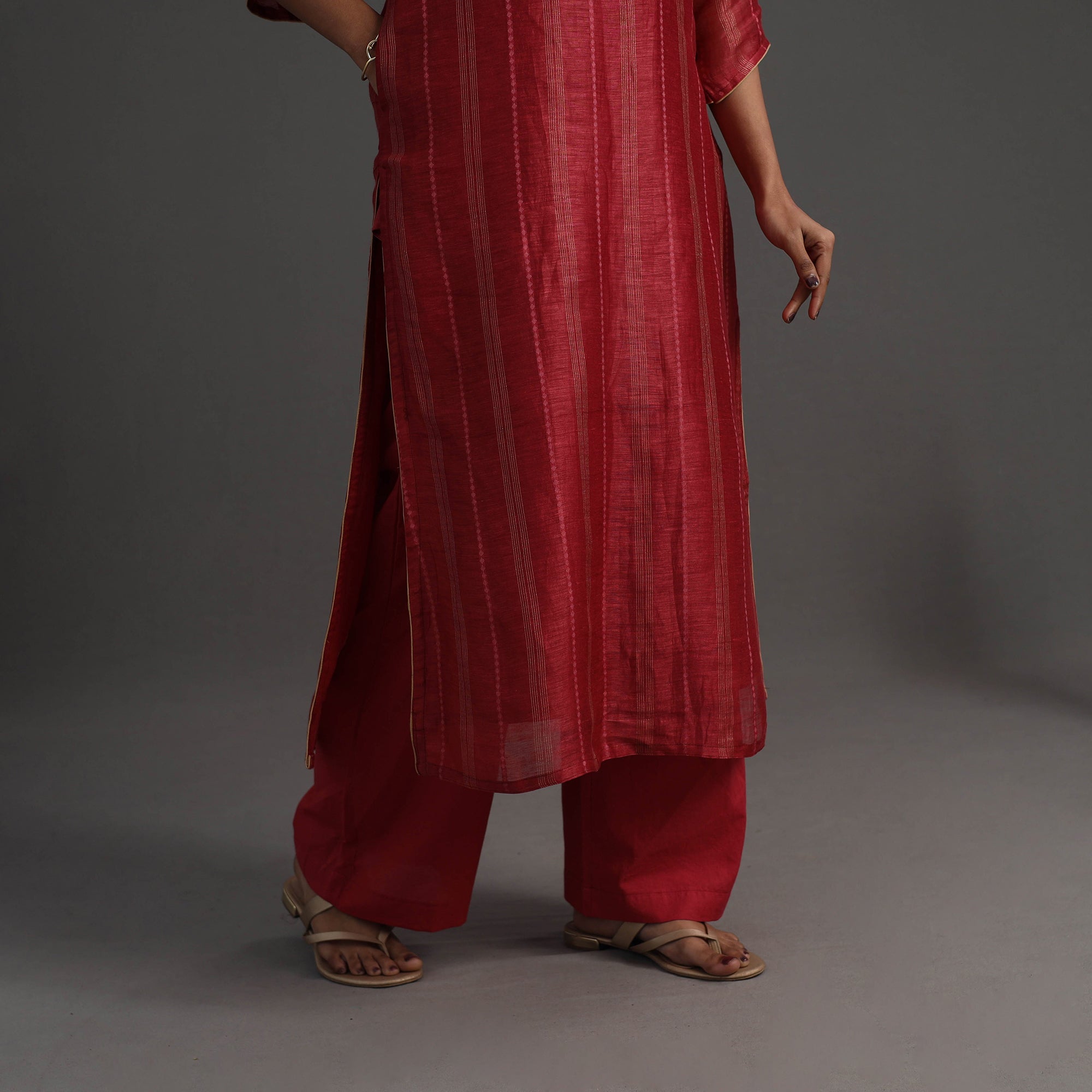 Elevate your wardrobe with this elegant red plain linen silk handloom kurta sets, an exquisite blend of tradition and comfort. Handwoven from premium linen silk, the set features a pocketed kurta, a bordered dupatta, and cotton palazzos with an elasticized waist for all-day ease. Perfect for casual and formal occasions, this stitched suit set is a timeless addition to your collection. Explore sustainable fashion while supporting skilled artisans.
