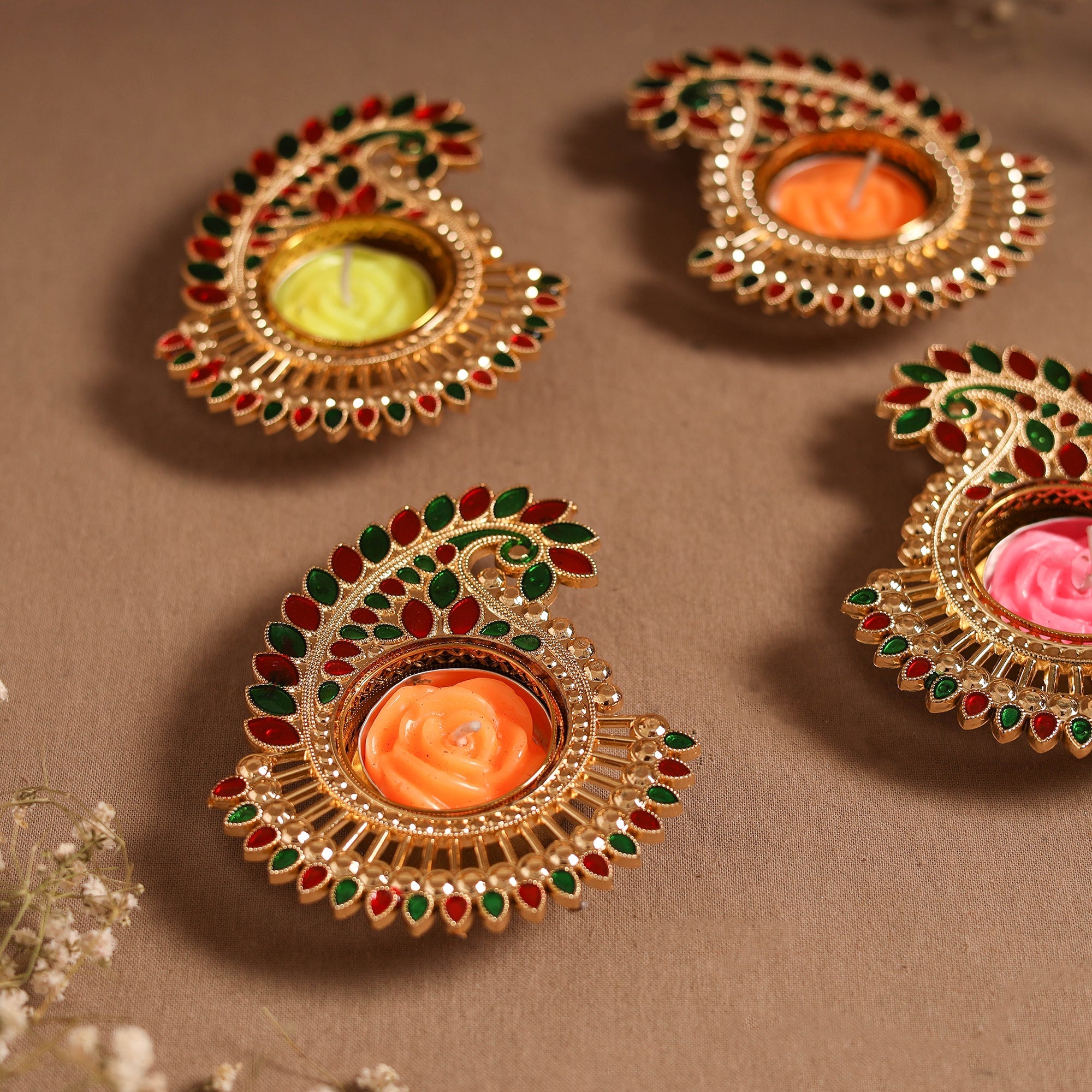 Brighten your home with this handmade tealight candle holder, designed with intricate detailing that reflects India’s rich artistry. Each piece showcases vibrant colors, unique decorative work, and comes with a rose-shaped candle, making it perfect for festivals, gatherings, or everyday decor. A beautiful blend of tradition and elegance, this holder adds warmth, charm, and a festive glow to any space.