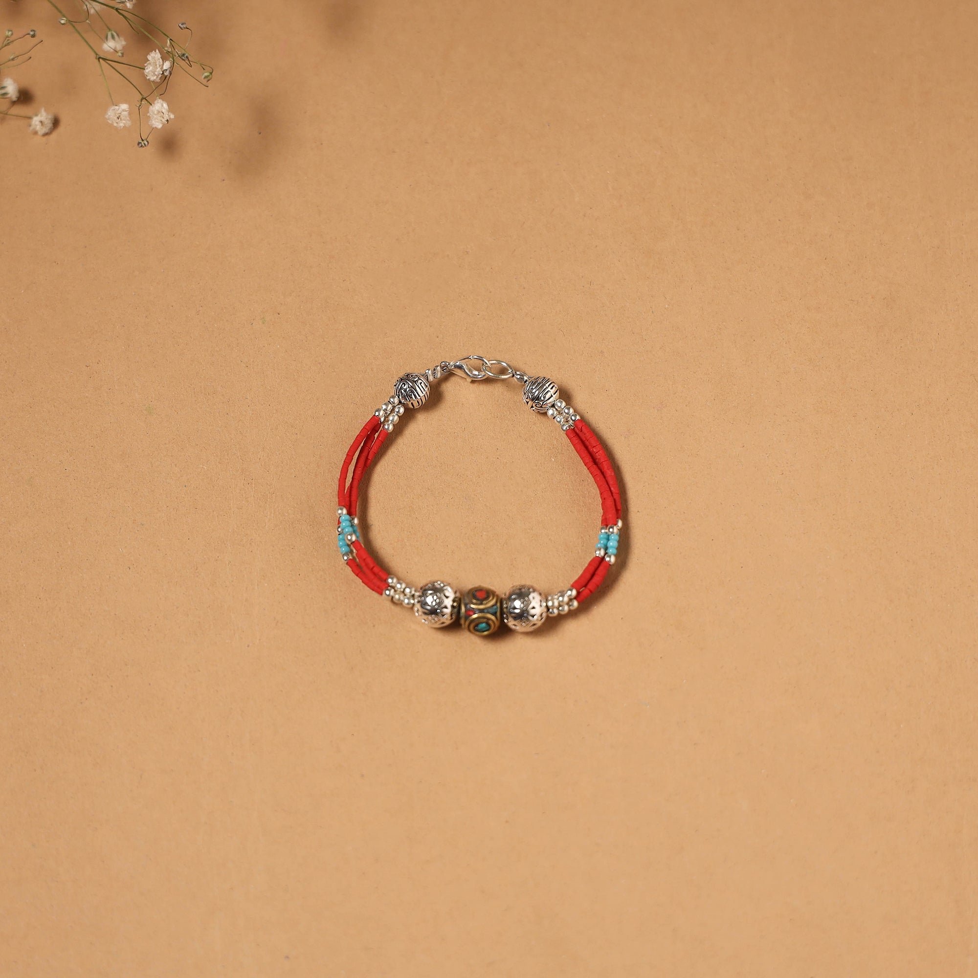 | Material | These ethnic red tribal tibetan bracelet from Himalayas, showcase the beauty of semi precious stones like turquoise and lapis lazuli intricately combined with beads, metal and alloy accents. Handmade by artisans the design reflects the essence of tibetan craftsmanship and culture. |