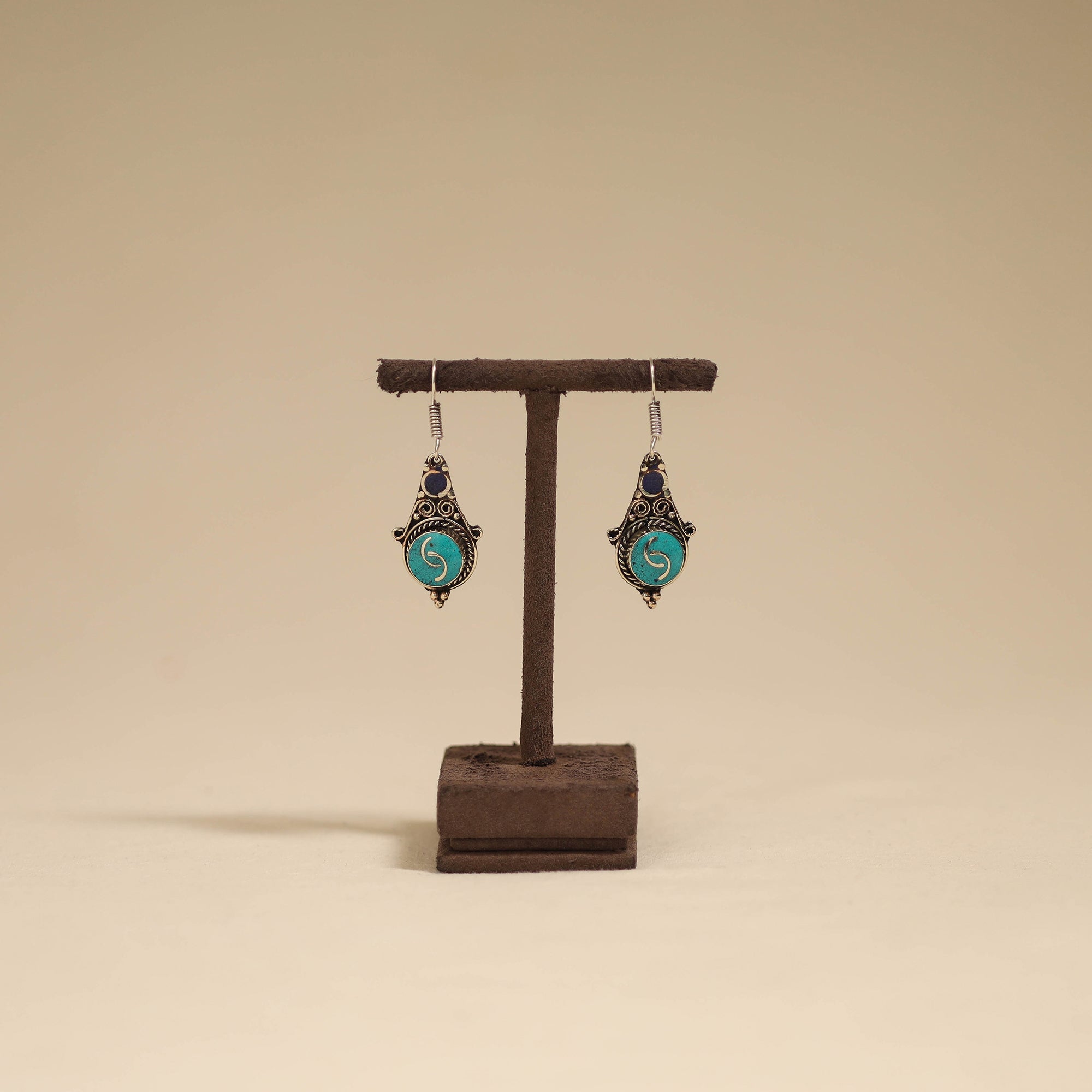 These ethnic tribal tibetan earrings from Himalayas, showcase the beauty of semi precious stones like turquoise and lapis lazuli intricately combined with metal and alloy accents. Handmade by artisans the design reflects the essence of tibetan craftsmanship and culture.