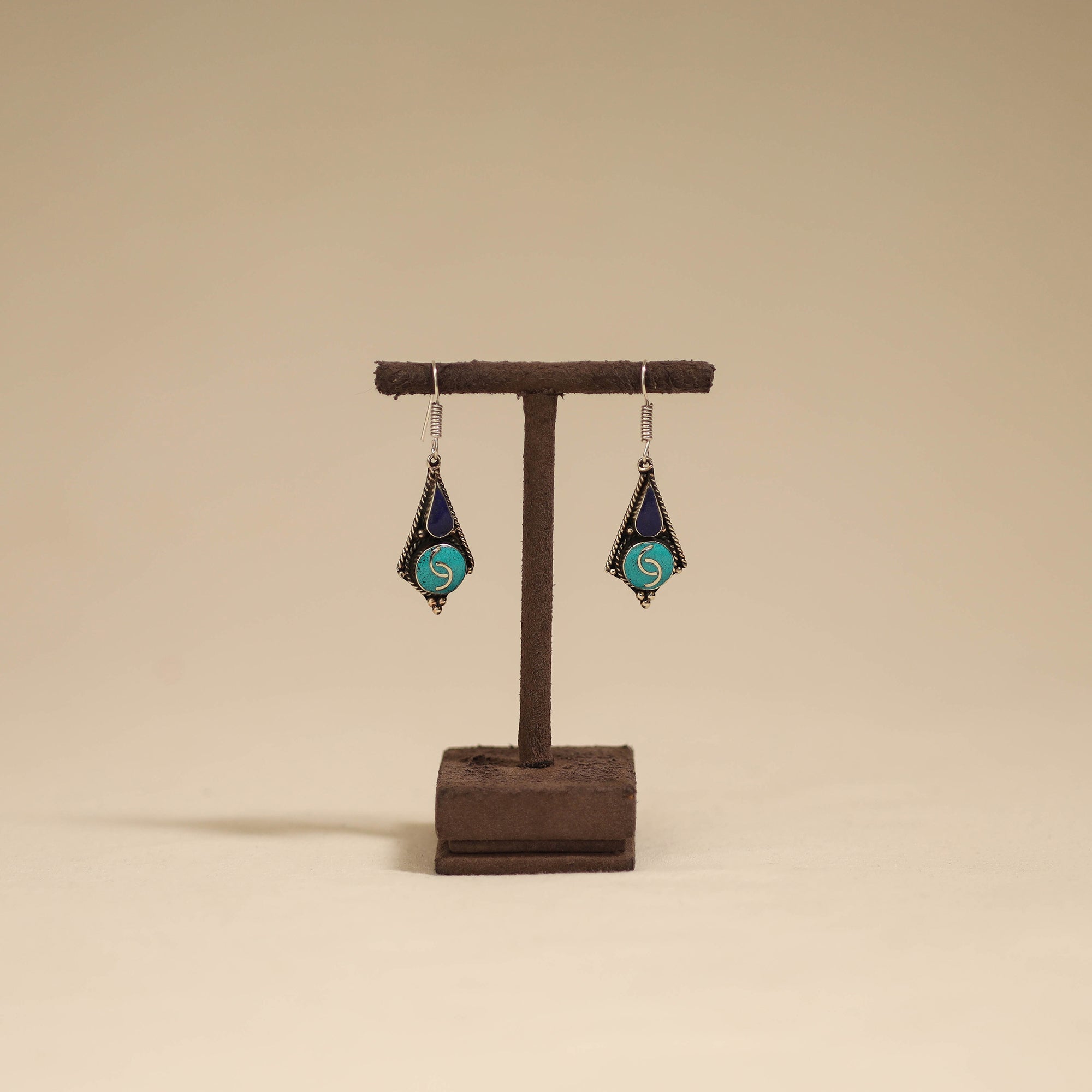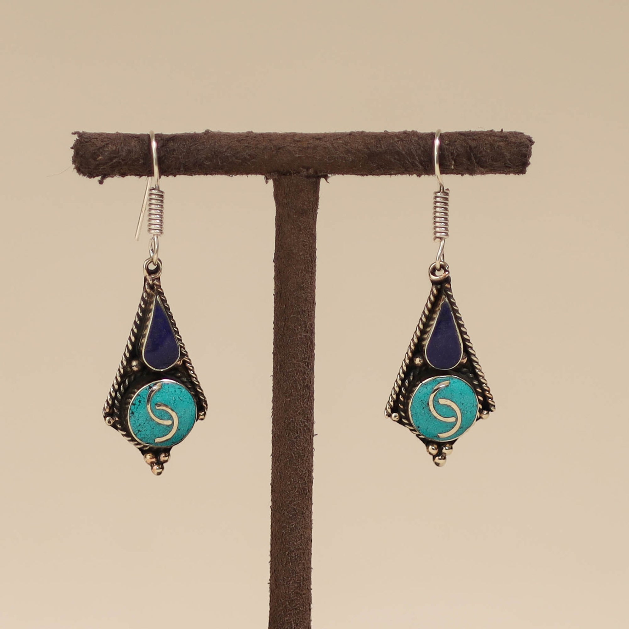 These ethnic tribal tibetan earrings from Himalayas, showcase the beauty of semi precious stones like turquoise and lapis lazuli intricately combined with metal and alloy accents. Handmade by artisans the design reflects the essence of tibetan craftsmanship and culture.