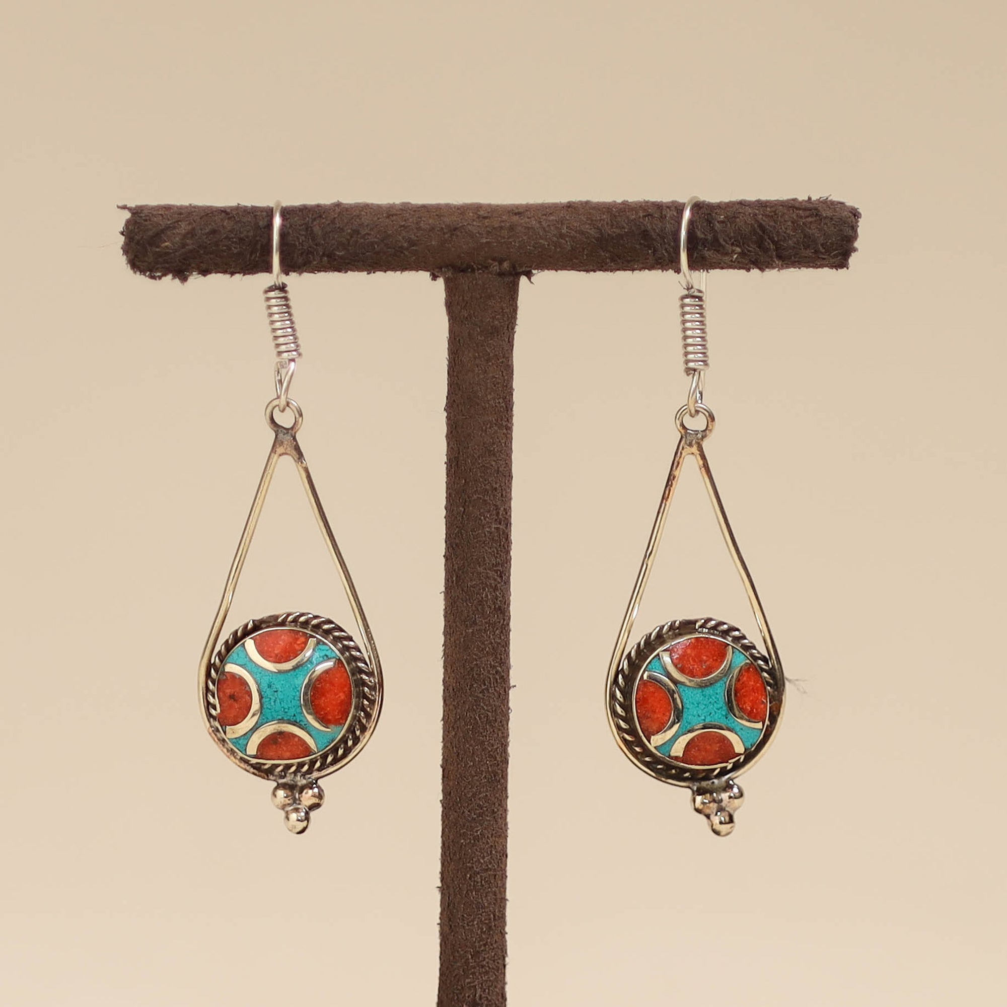 These ethnic tribal tibetan earrings from Himalayas, showcase the beauty of semi precious stones like turquoise and lapis lazuli intricately combined with metal and alloy accents. Handmade by artisans the design reflects the essence of tibetan craftsmanship and culture.