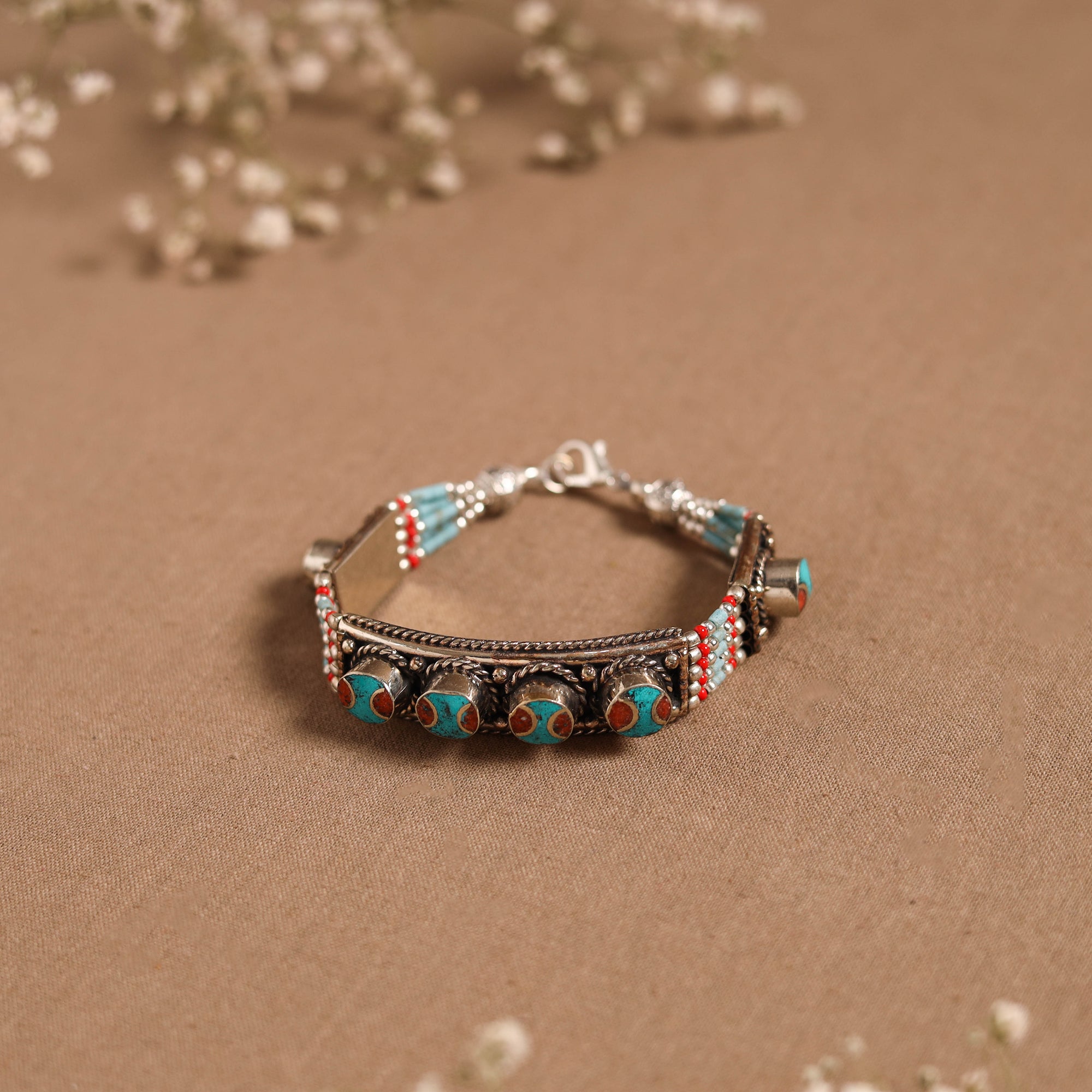 | Material | This blue ethnic tribal tibetan metal bracelet, handcrafted in the Himalayas, showcase the beauty of semi-precious stones like turquoise and lapis lazuli, intricately combined with beads, metal, and alloy accents. Carefully handmade by skilled artisans, the design reflects the essence of Tibetan craftsmanship and culture. Perfect to pair with both ethnic and fusion outfits. |