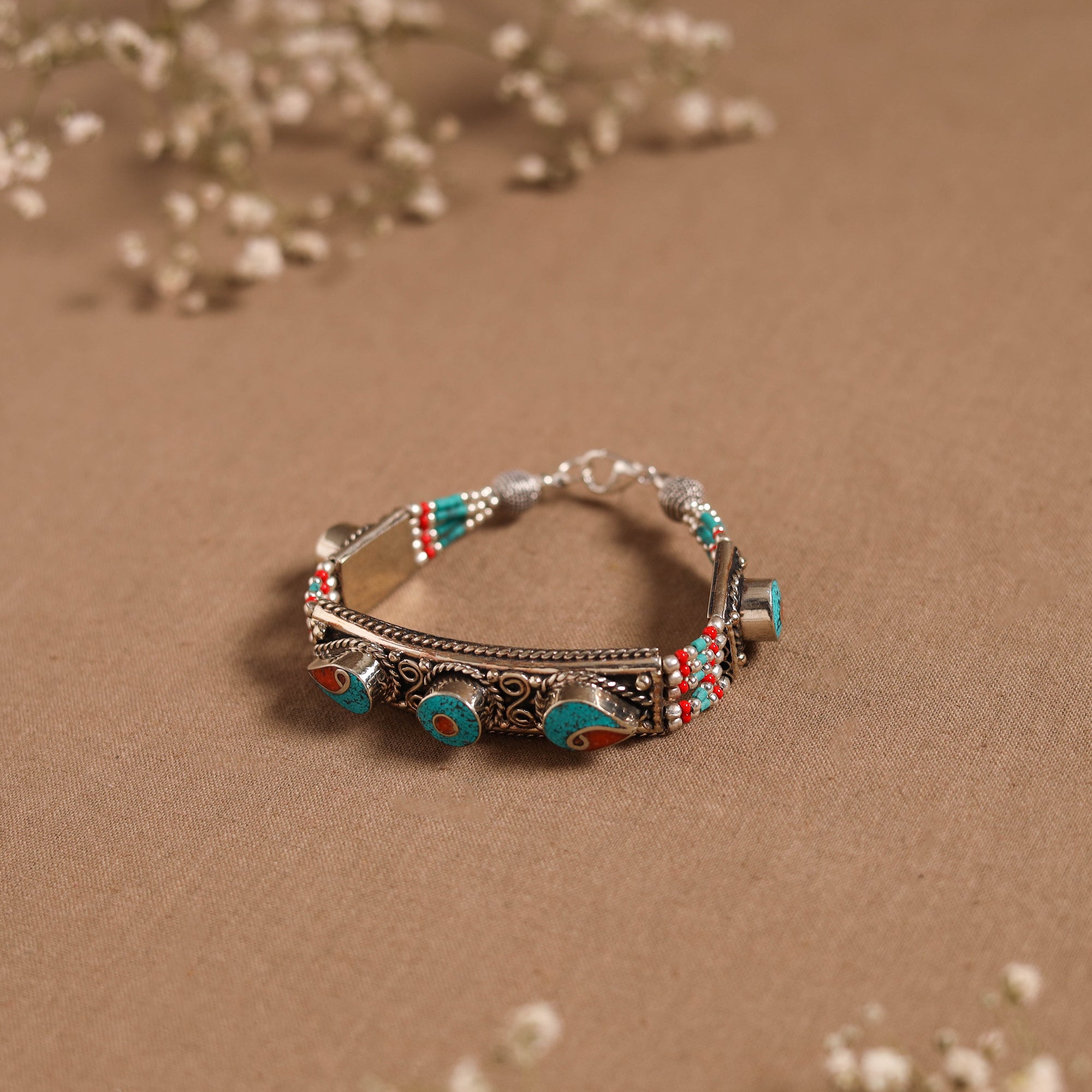 | Material | This blue ethnic tribal tibetan metal bracelet, handcrafted in the Himalayas, showcase the beauty of semi-precious stones like turquoise and lapis lazuli, intricately combined with beads, metal, and alloy accents. Carefully handmade by skilled artisans, the design reflects the essence of Tibetan craftsmanship and culture. Perfect to pair with both ethnic and fusion outfits. |