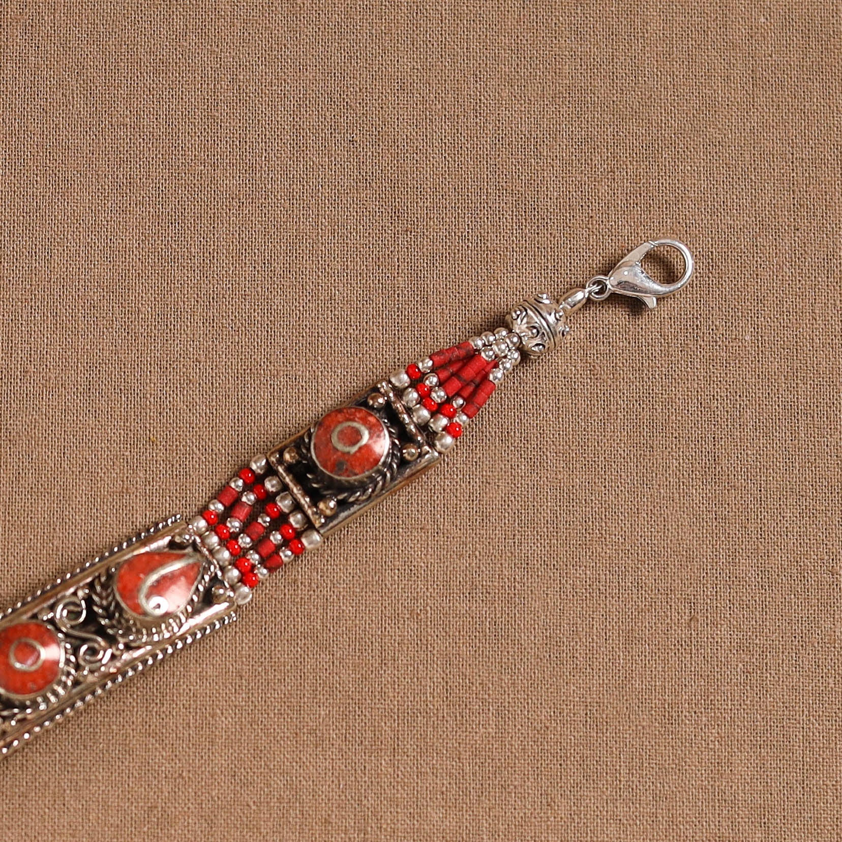 | Material | This red ethnic tribal tibetan metal bracelet, handcrafted in the Himalayas, showcase the beauty of semi-precious stones like turquoise and lapis lazuli, intricately combined with beads, metal, and alloy accents. Carefully handmade by skilled artisans, the design reflects the essence of Tibetan craftsmanship and culture. Perfect to pair with both ethnic and fusion outfits. |