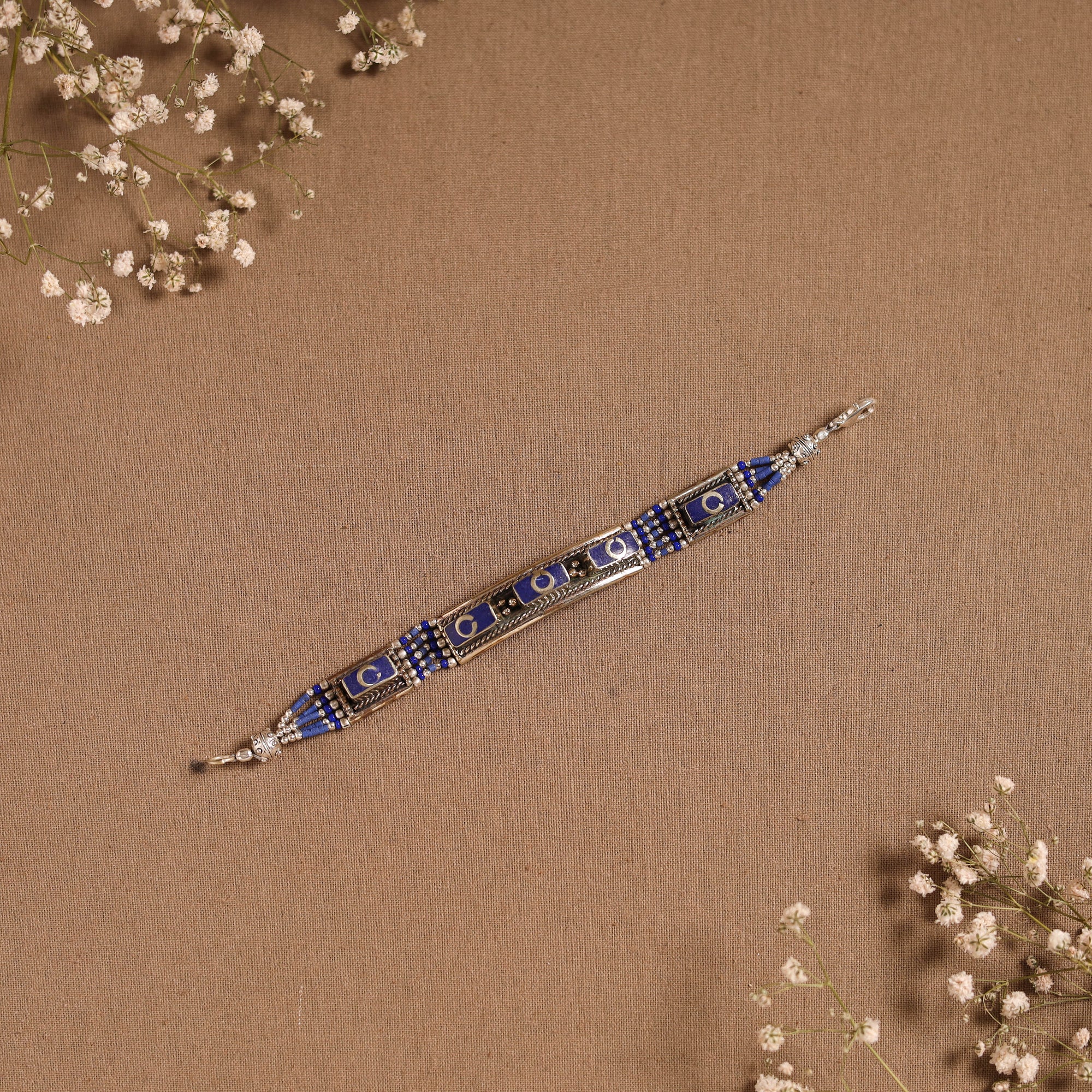 | Material | This blue ethnic tribal tibetan metal bracelet, handcrafted in the Himalayas, showcase the beauty of semi-precious stones like turquoise and lapis lazuli, intricately combined with beads, metal, and alloy accents. Carefully handmade by skilled artisans, the design reflects the essence of Tibetan craftsmanship and culture. Perfect to pair with both ethnic and fusion outfits. |