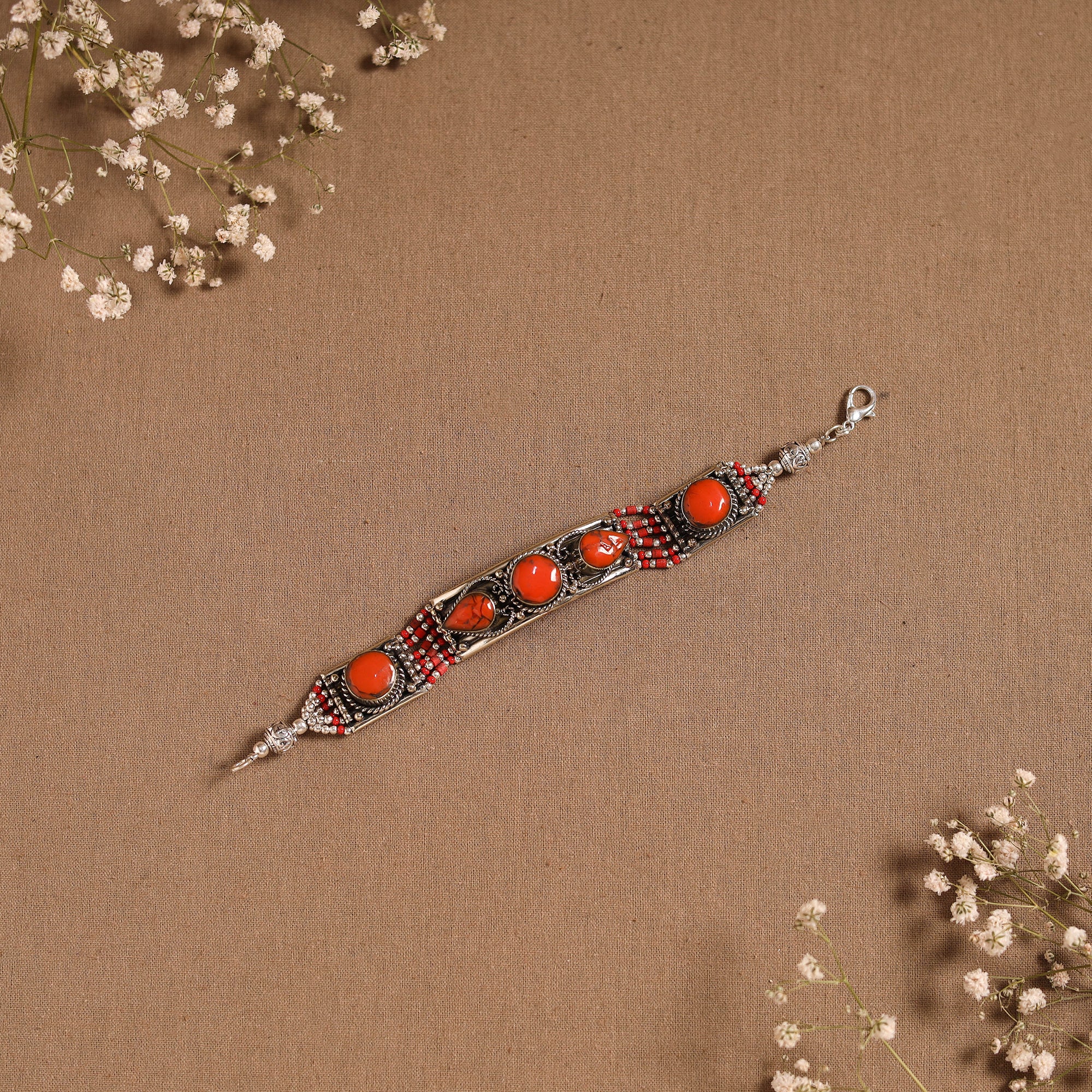 | Material | This orange ethnic tribal tibetan metal bracelet, handcrafted in the Himalayas, showcase the beauty of semi-precious stones like turquoise and lapis lazuli, intricately combined with beads, metal, and alloy accents. Carefully handmade by skilled artisans, the design reflects the essence of Tibetan craftsmanship and culture. Perfect to pair with both ethnic and fusion outfits. |