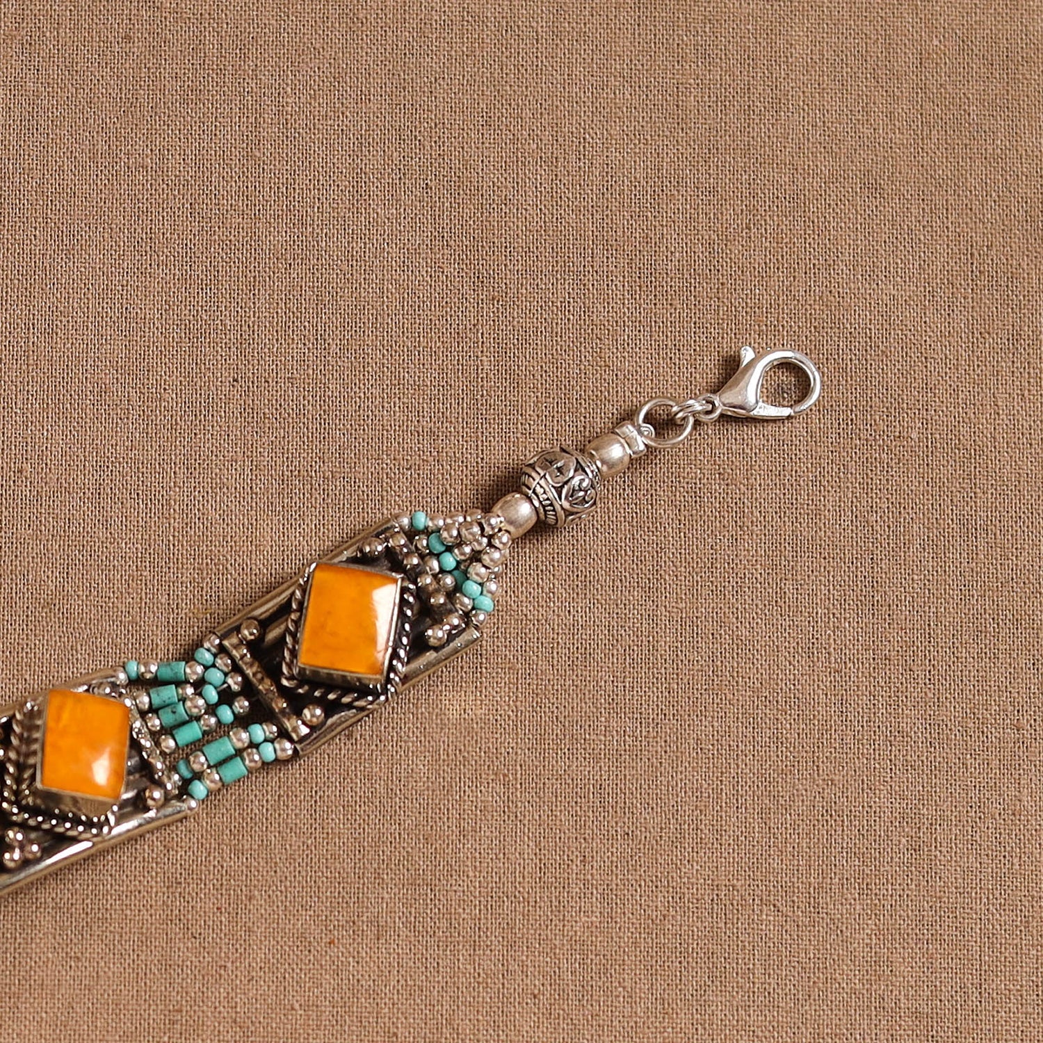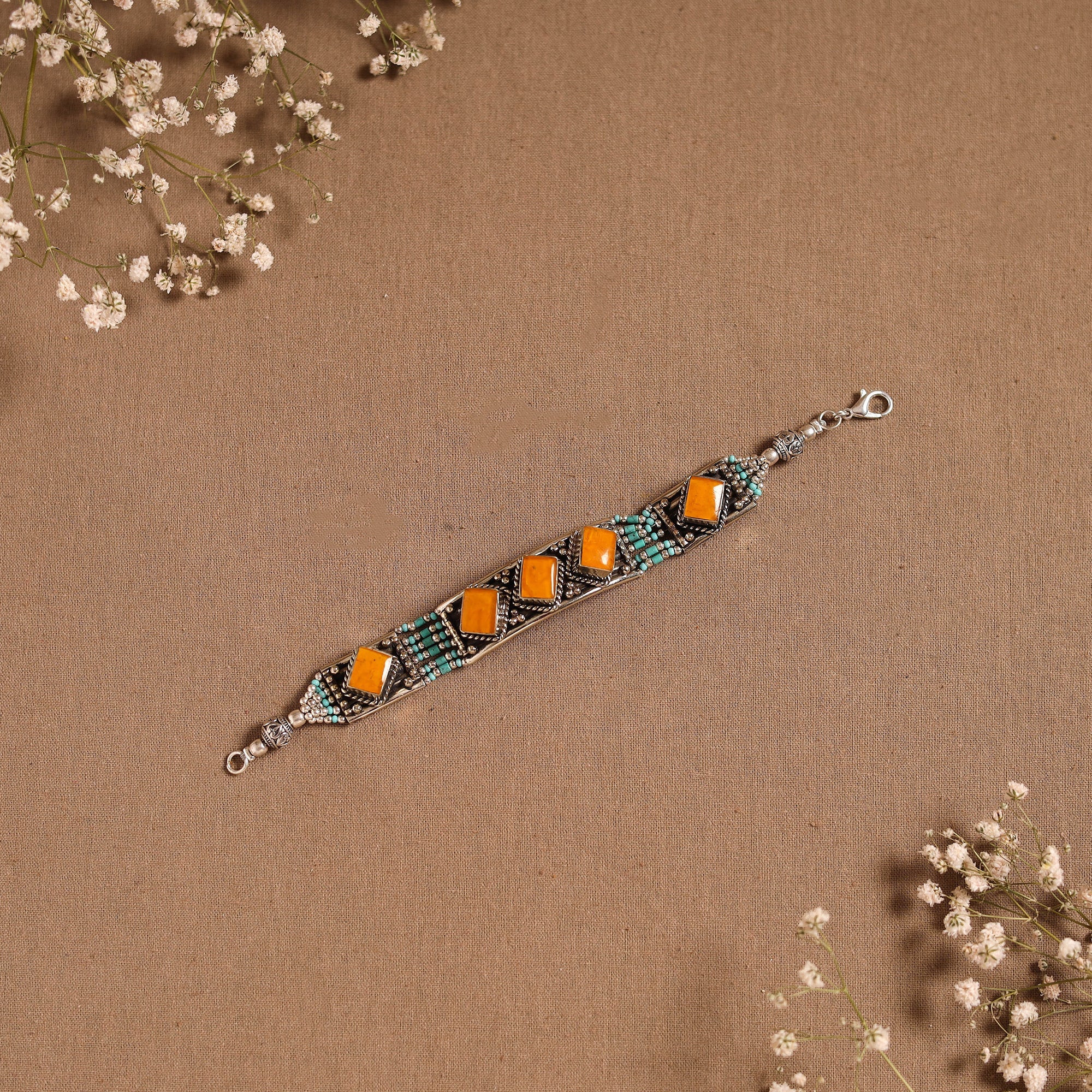 | Material | This orange ethnic tribal tibetan metal bracelet, handcrafted in the Himalayas, showcase the beauty of semi-precious stones like turquoise and lapis lazuli, intricately combined with beads, metal, and alloy accents. Carefully handmade by skilled artisans, the design reflects the essence of Tibetan craftsmanship and culture. Perfect to pair with both ethnic and fusion outfits. |