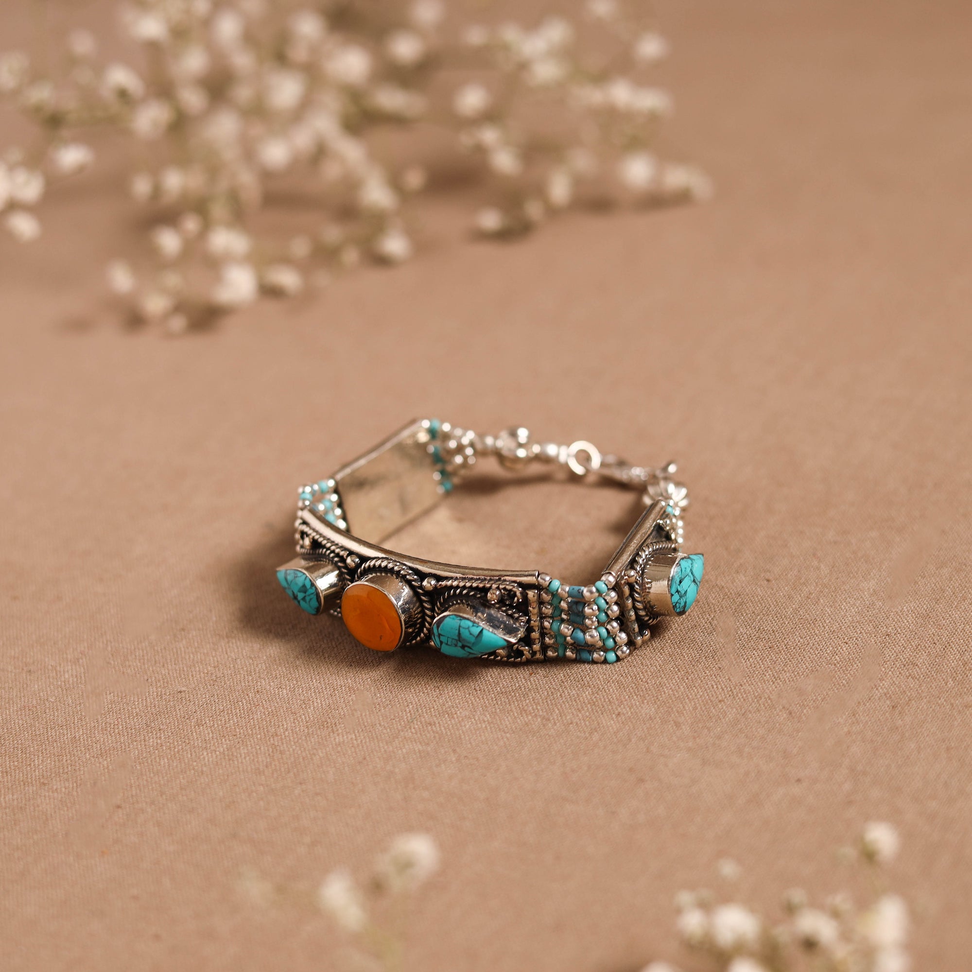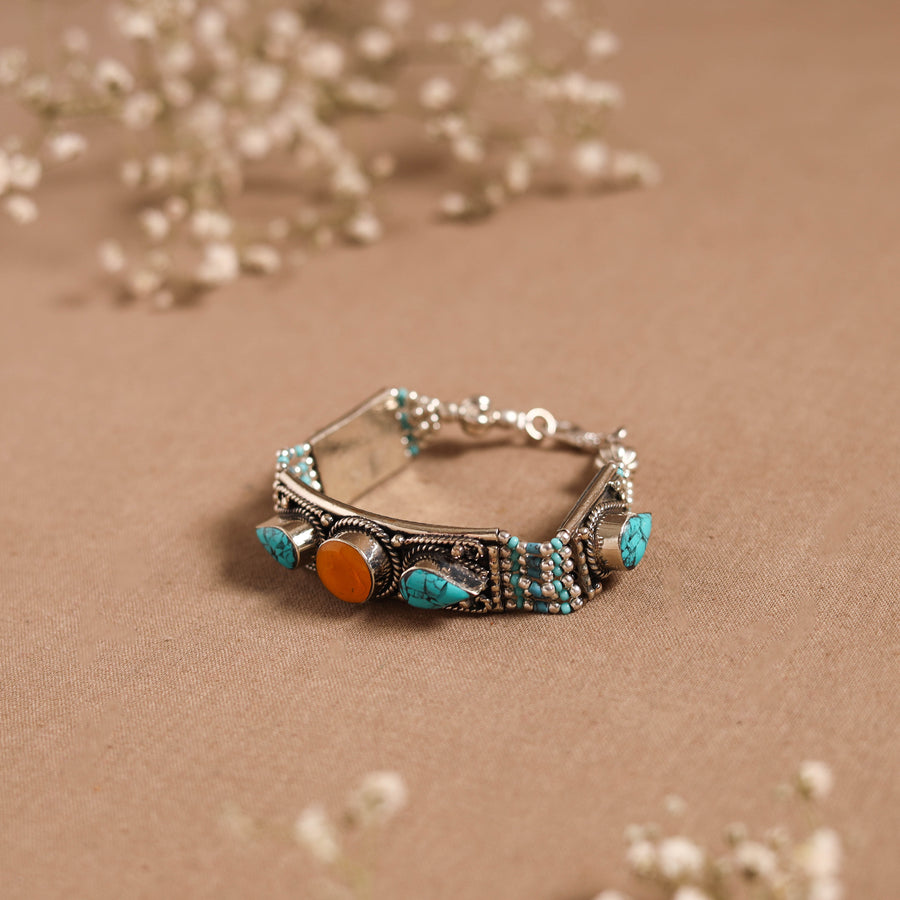 | Material | This blue ethnic tribal tibetan metal bracelet, handcrafted in the Himalayas, showcase the beauty of semi-precious stones like turquoise and lapis lazuli, intricately combined with beads, metal, and alloy accents. Carefully handmade by skilled artisans, the design reflects the essence of Tibetan craftsmanship and culture. Perfect to pair with both ethnic and fusion outfits. |