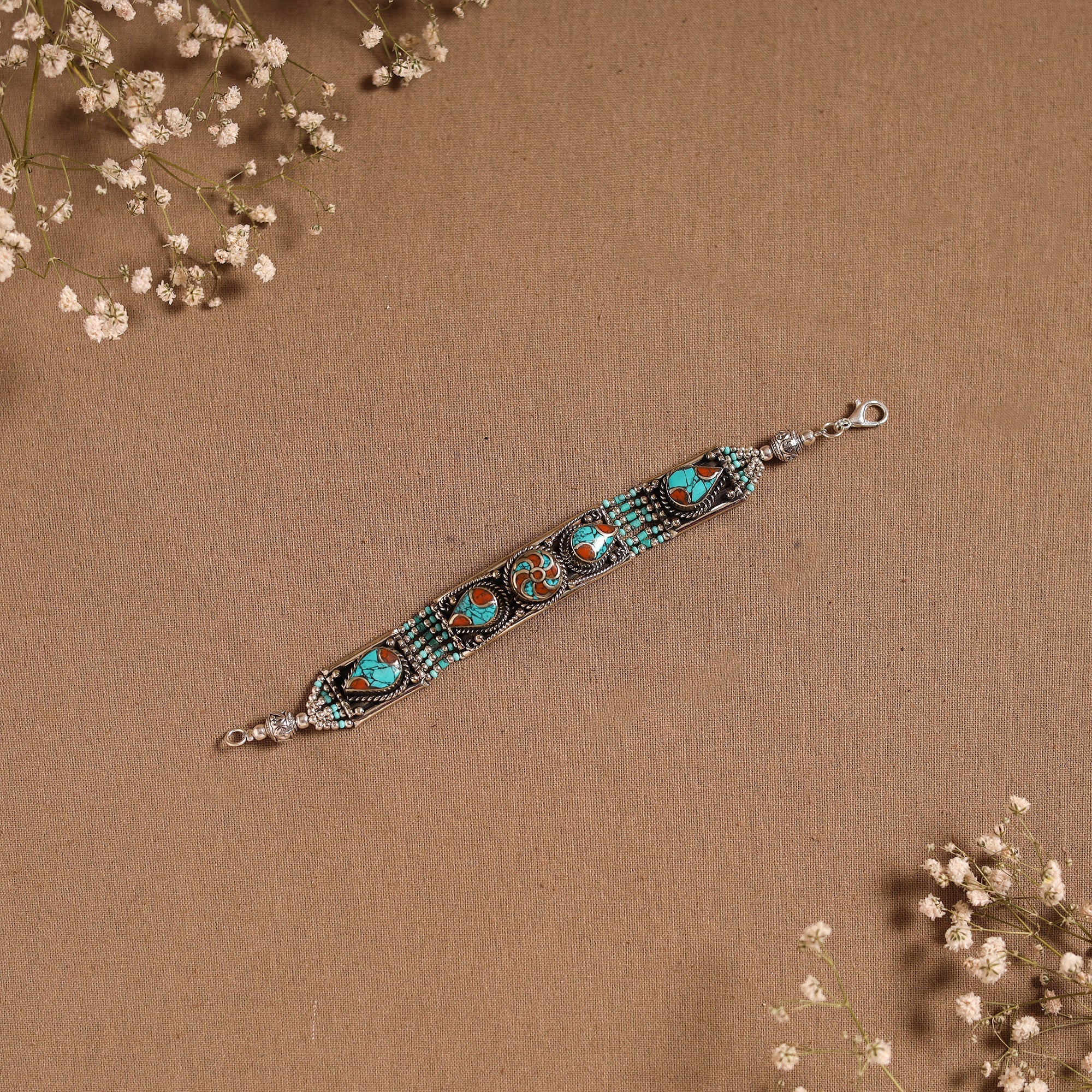 | Material | This blue ethnic tribal tibetan metal bracelet, handcrafted in the Himalayas, showcase the beauty of semi-precious stones like turquoise and lapis lazuli, intricately combined with beads, metal, and alloy accents. Carefully handmade by skilled artisans, the design reflects the essence of Tibetan craftsmanship and culture. Perfect to pair with both ethnic and fusion outfits. |