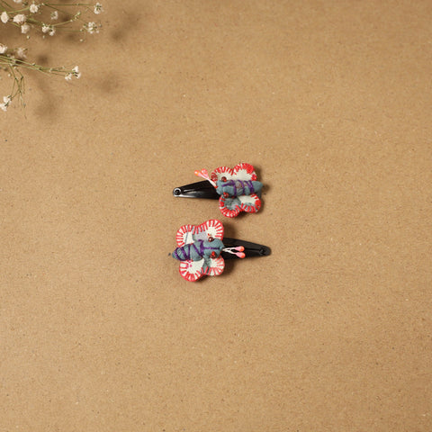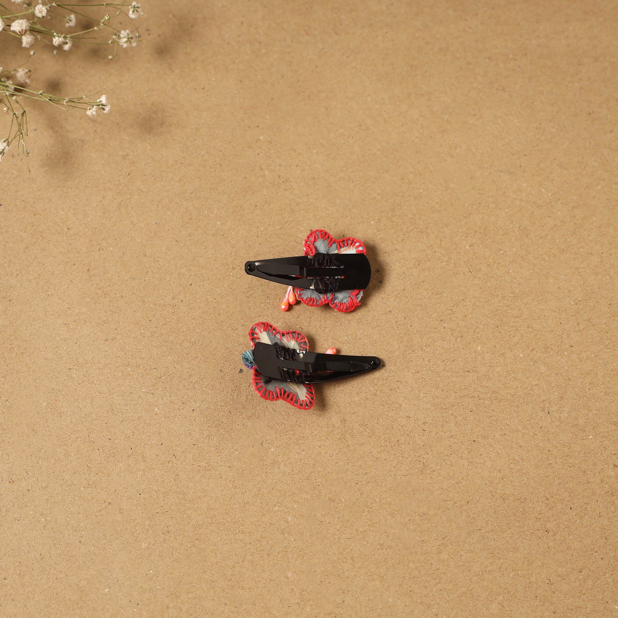 Fab artwork tik-tak hair clip for kids (set of 2) is made from recycled fabric scraps and finished with thread embroidery and beads. Handcrafted by artisan Shanti Paswan (Jan sandesh), these lightweight clips offer a secure grip and playful design, making them ideal for comfortable everyday wear.
