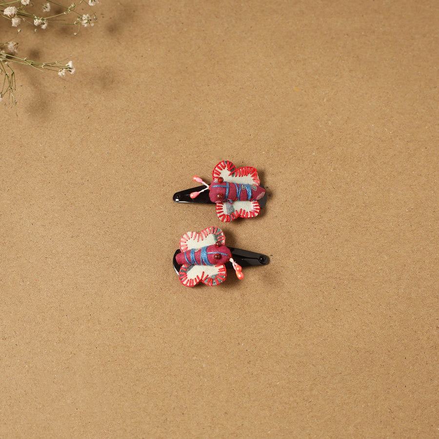 Fab artwork tik-tak hair clip for kids (set of 2) is made from recycled fabric scraps and finished with thread embroidery and beads. Handcrafted by artisan Shanti Paswan (Jan sandesh), these lightweight clips offer a secure grip and playful design, making them ideal for comfortable everyday wear.