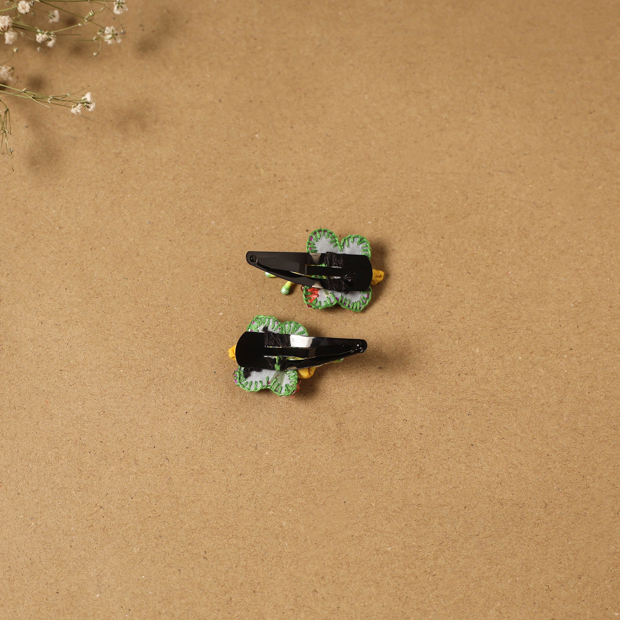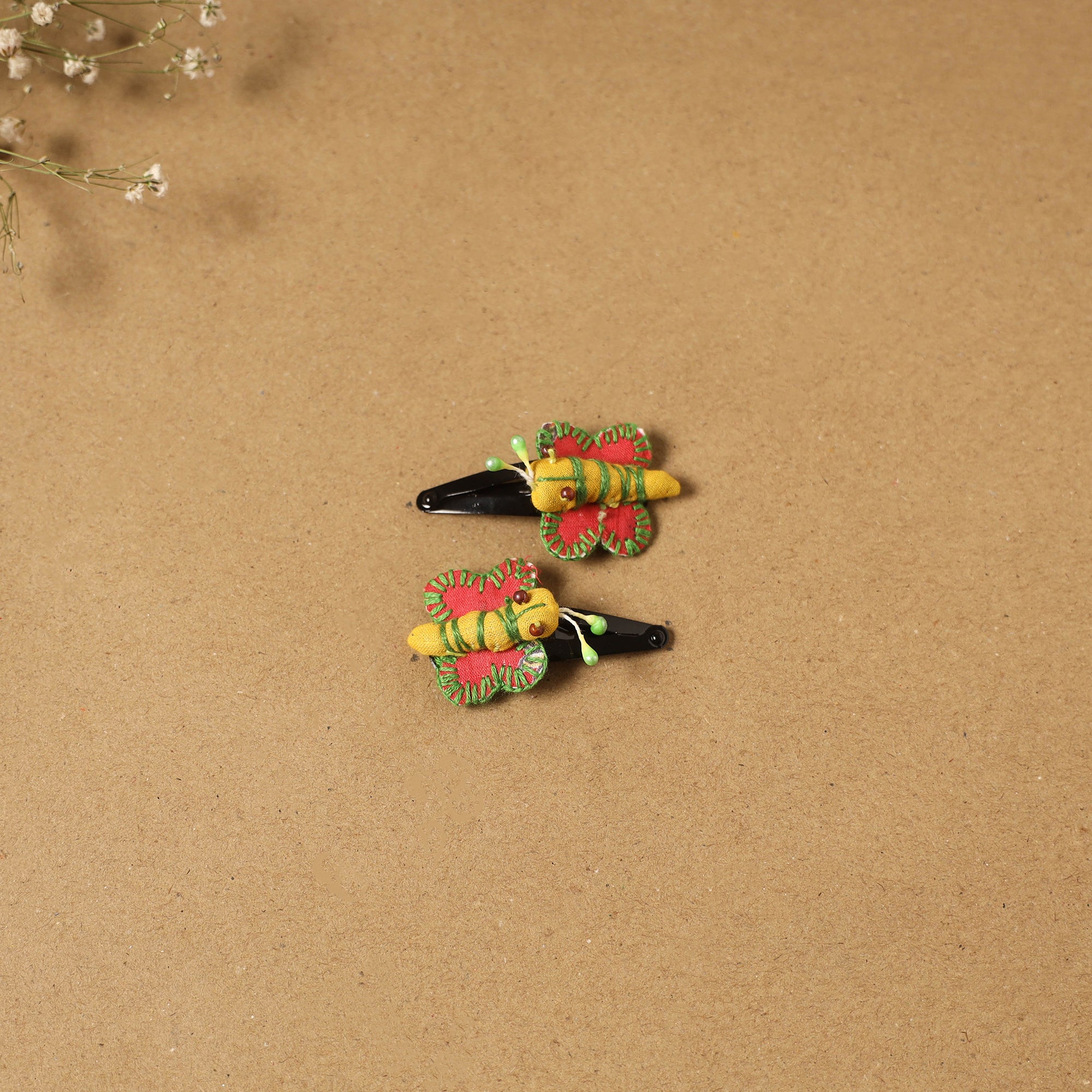 Fab artwork tik-tak hair clip for kids (set of 2) is made from recycled fabric scraps and finished with thread embroidery and beads. Handcrafted by artisan Shanti Paswan (Jan sandesh), these lightweight clips offer a secure grip and playful design, making them ideal for comfortable everyday wear.