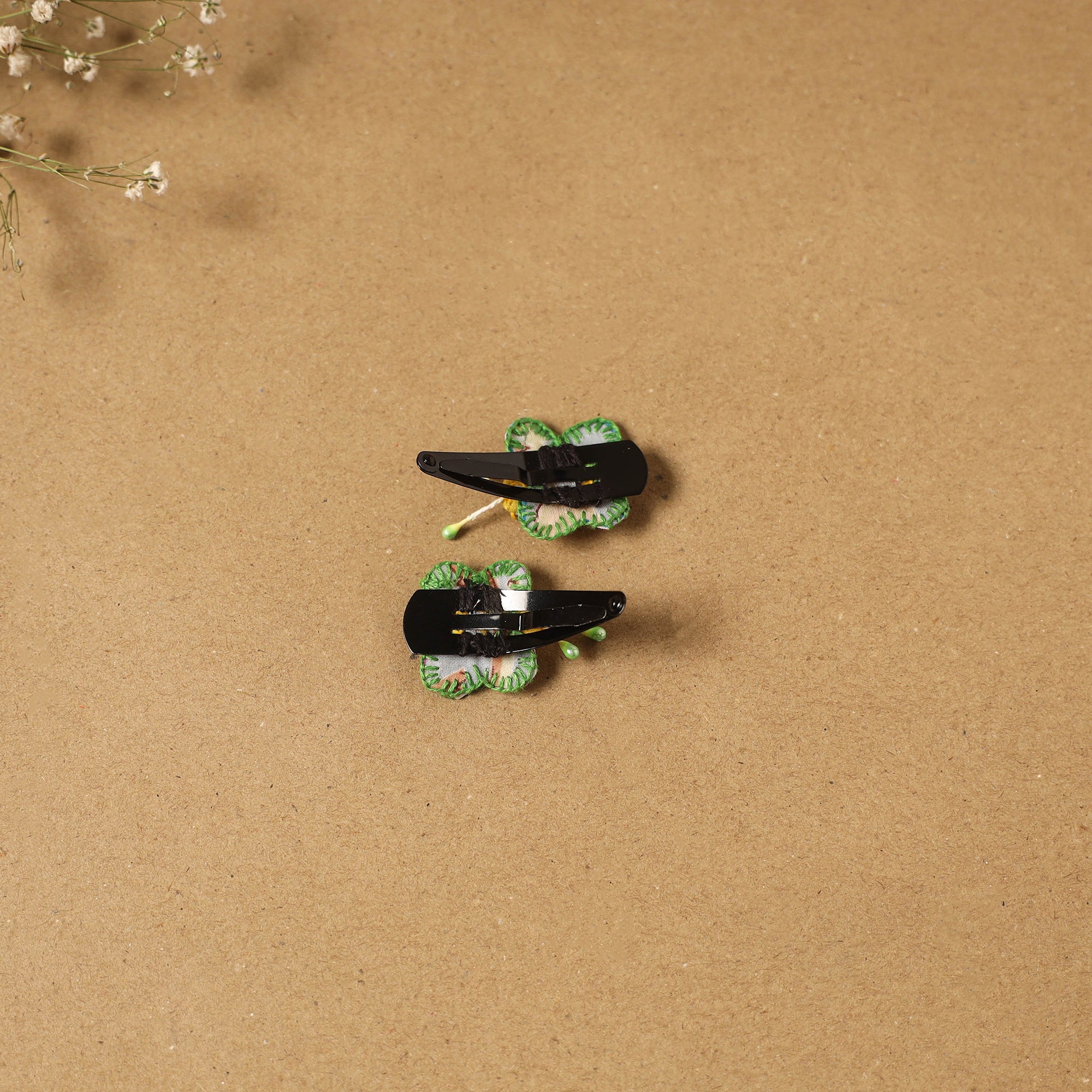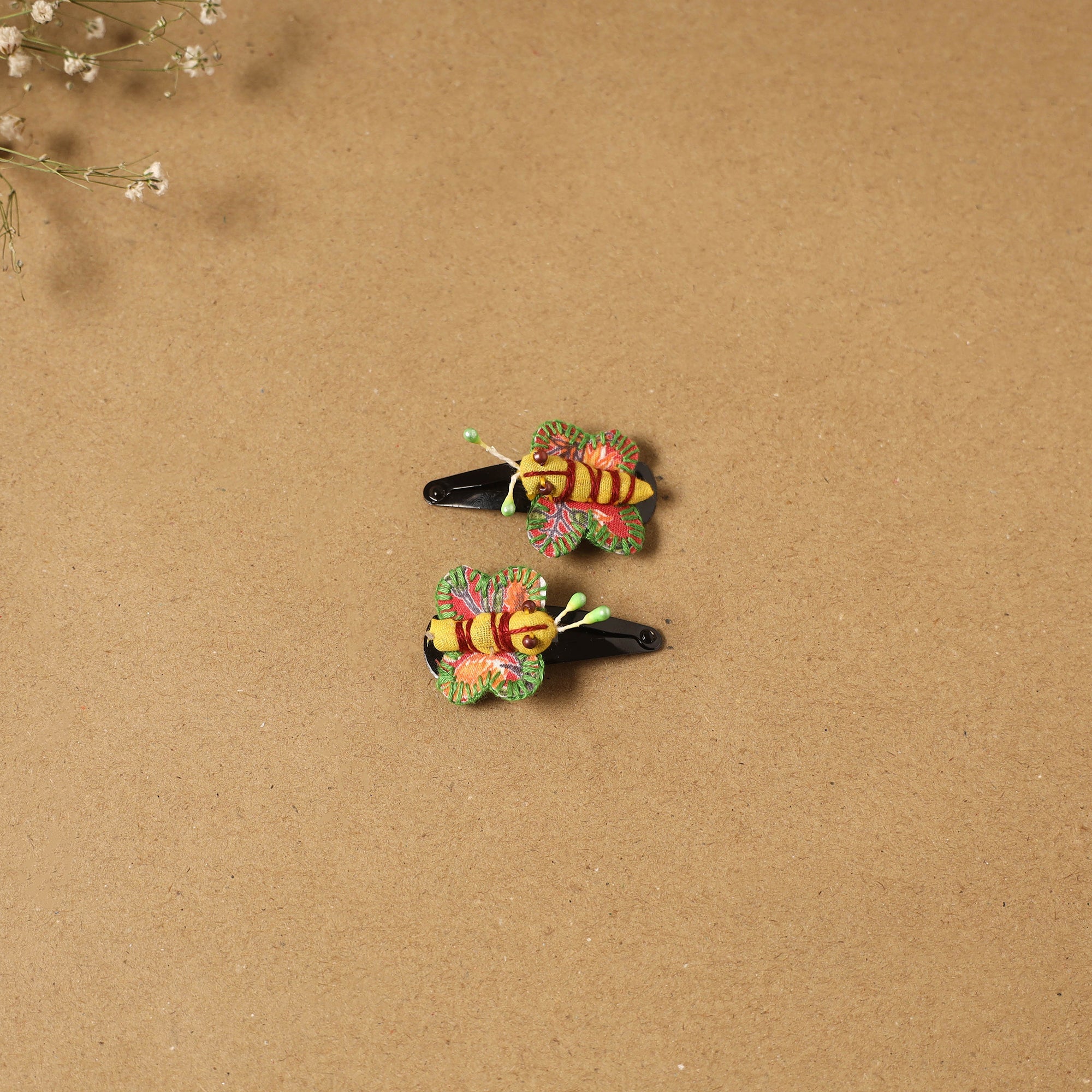 Fab artwork tik-tak hair clip for kids (set of 2) is made from recycled fabric scraps and finished with thread embroidery and beads. Handcrafted by artisan Shanti Paswan (Jan sandesh), these lightweight clips offer a secure grip and playful design, making them ideal for comfortable everyday wear.