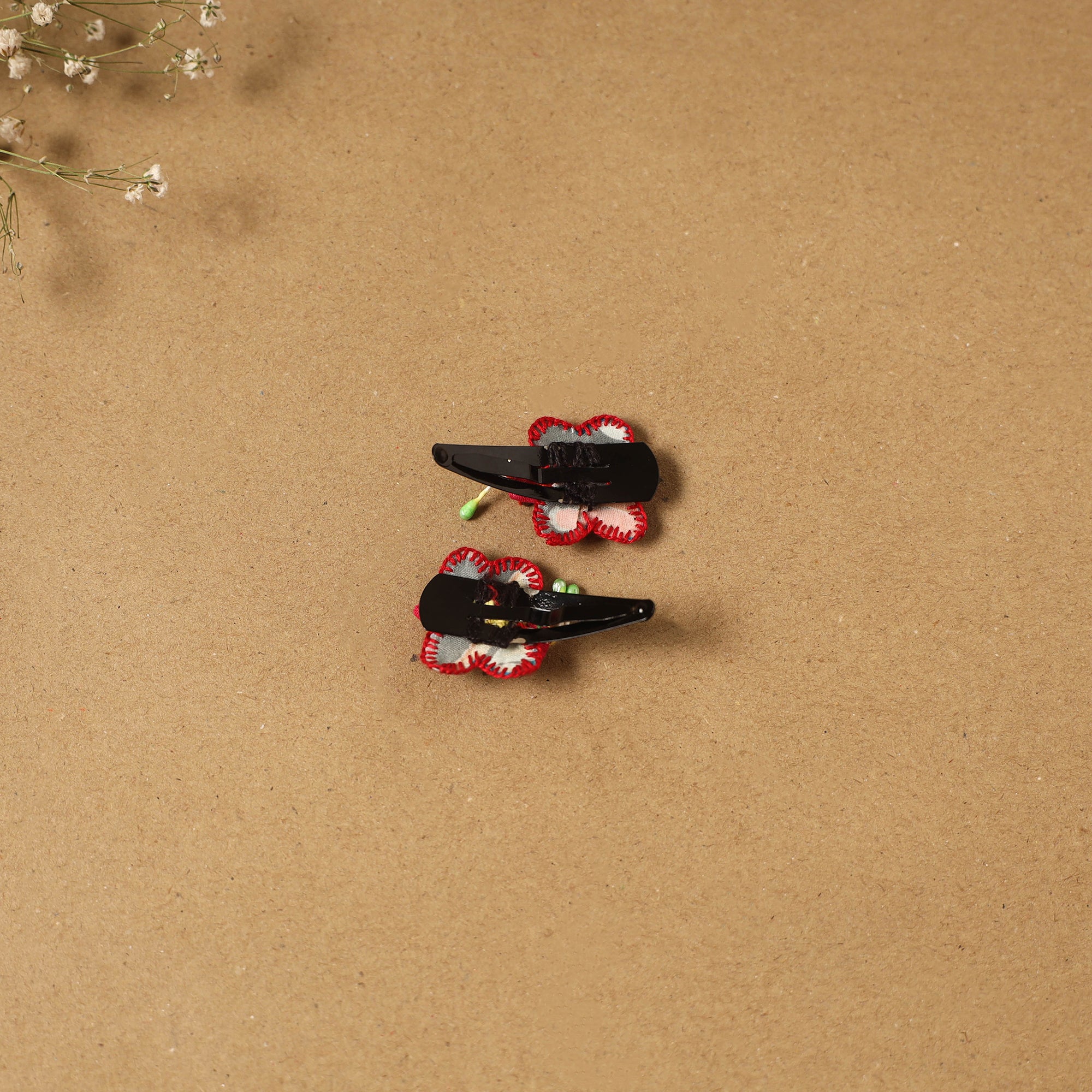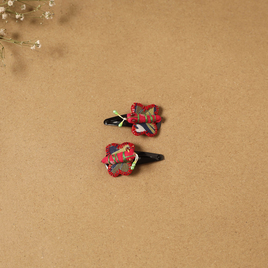 Fab artwork tik-tak hair clip for kids (set of 2) is made from recycled fabric scraps and finished with thread embroidery and beads. Handcrafted by artisan Shanti Paswan (Jan sandesh), these lightweight clips offer a secure grip and playful design, making them ideal for comfortable everyday wear.