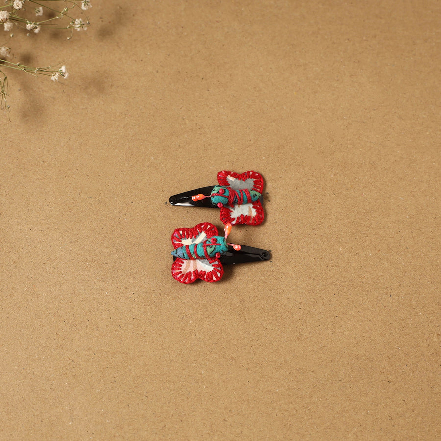 Fab artwork tik-tak hair clip for kids (set of 2) is made from recycled fabric scraps and finished with thread embroidery and beads. Handcrafted by artisan Shanti Paswan (Jan sandesh), these lightweight clips offer a secure grip and playful design, making them ideal for comfortable everyday wear.