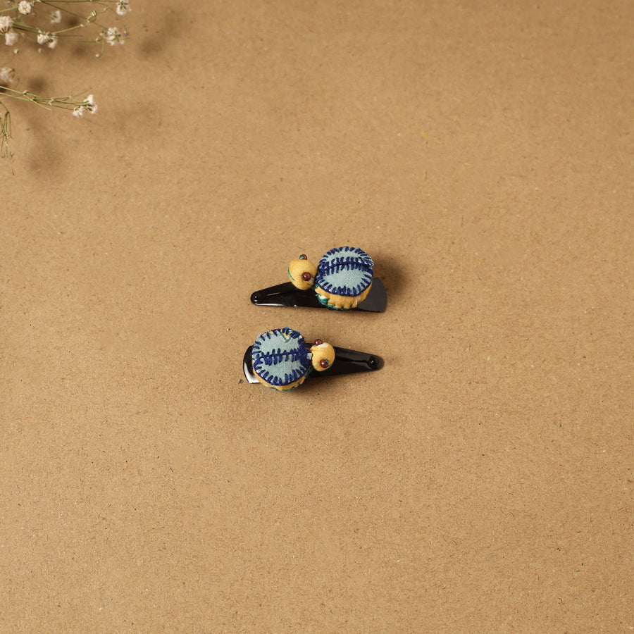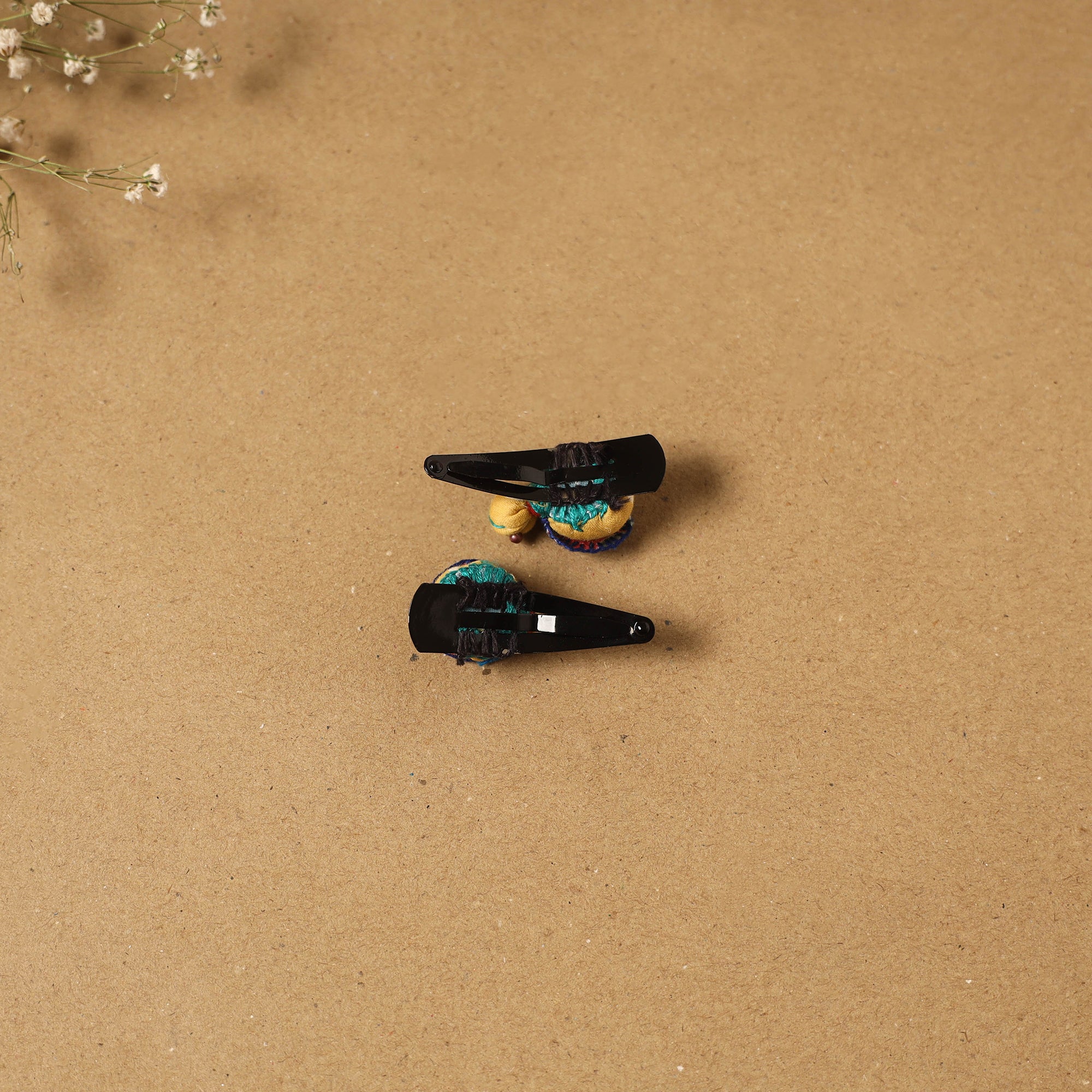 Fab artwork tik-tak hair clip for kids (set of 2) is made from recycled fabric scraps and finished with thread embroidery and beads. Handcrafted by artisan Shanti Paswan (Jan sandesh), these lightweight clips offer a secure grip and playful design, making them ideal for comfortable everyday wear.