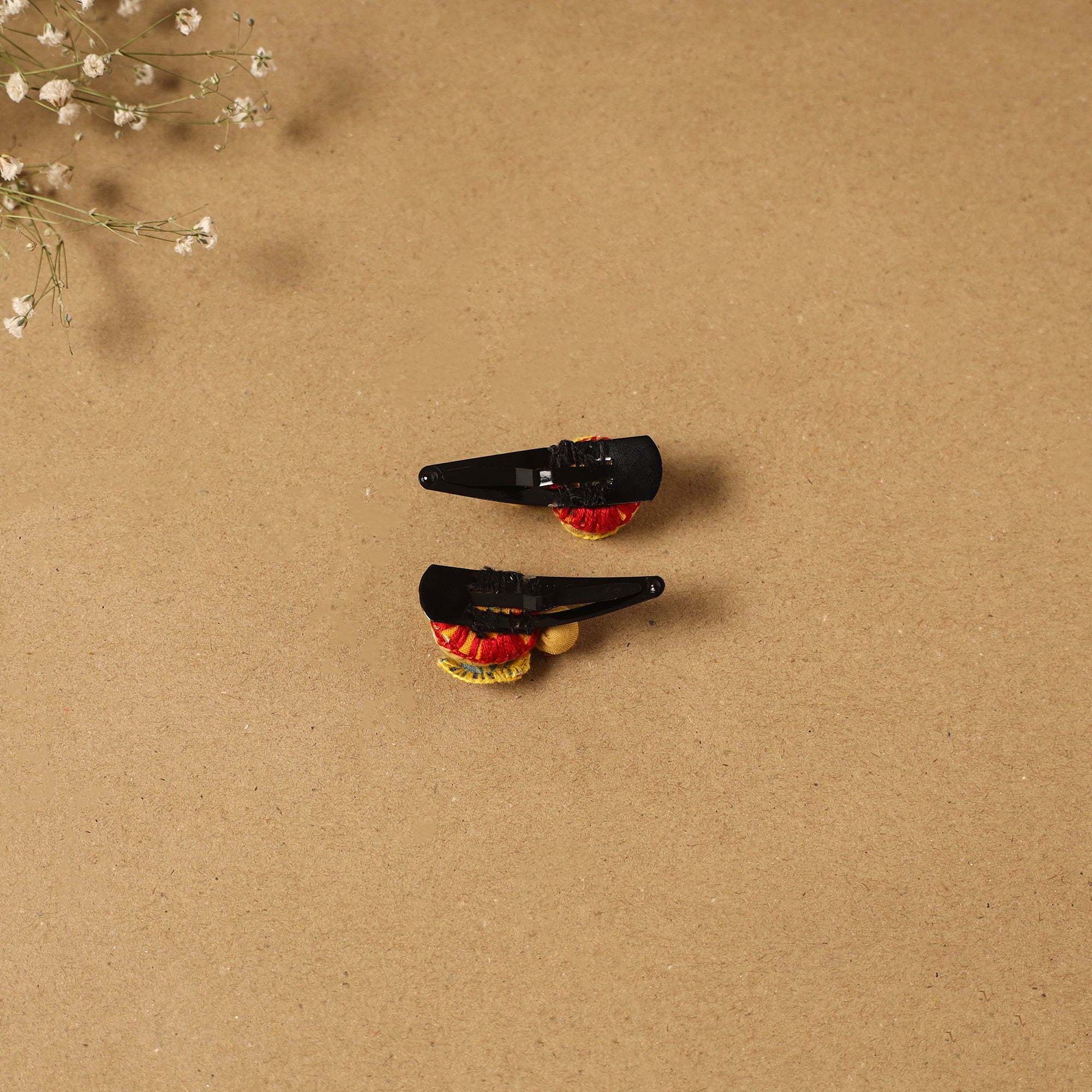 Fab artwork tik-tak hair clip for kids (set of 2) is made from recycled fabric scraps and finished with thread embroidery and beads. Handcrafted by artisan Shanti Paswan (Jan sandesh), these lightweight clips offer a secure grip and playful design, making them ideal for comfortable everyday wear.