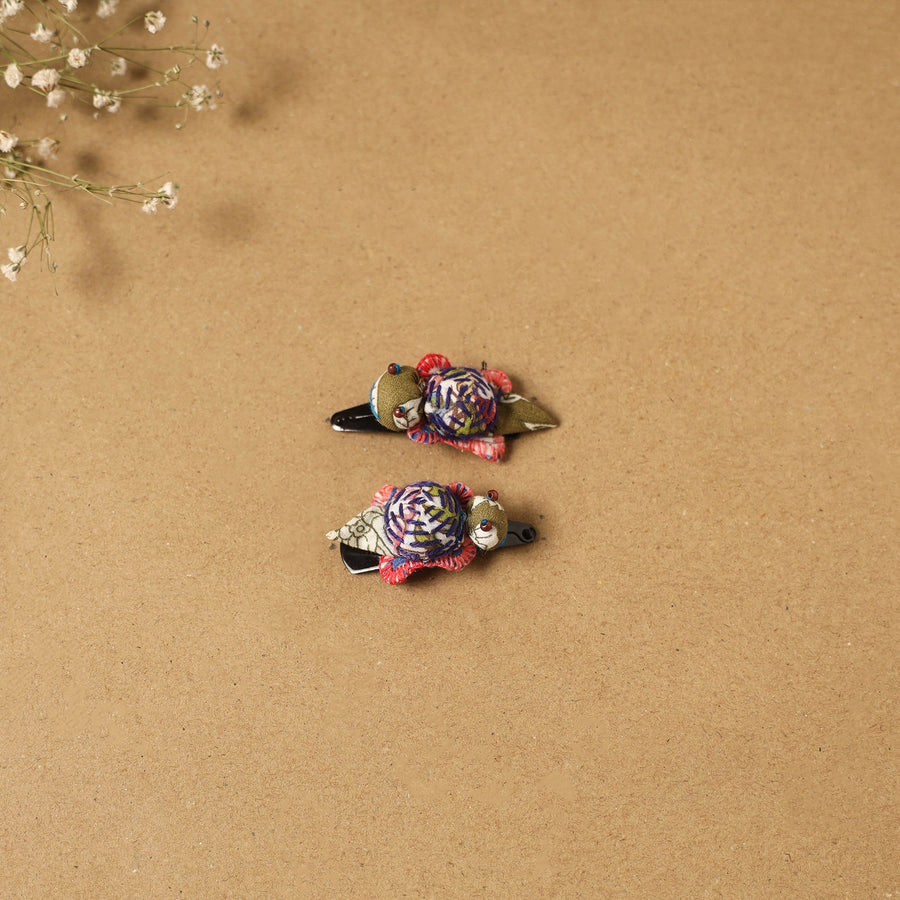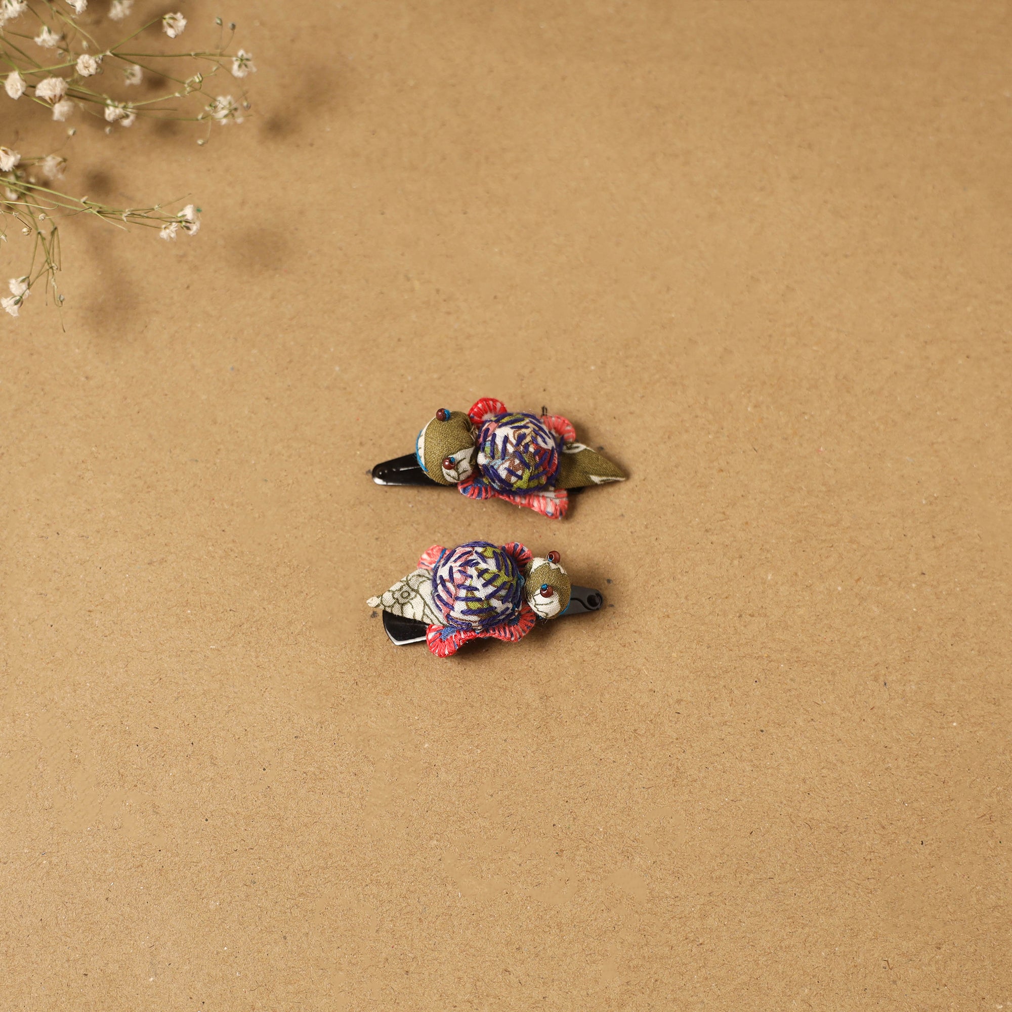 Fab artwork tik-tak hair clip for kids (set of 2) is made from recycled fabric scraps and finished with thread embroidery and beads. Handcrafted by artisan Shanti Paswan (Jan sandesh), these lightweight clips offer a secure grip and playful design, making them ideal for comfortable everyday wear.