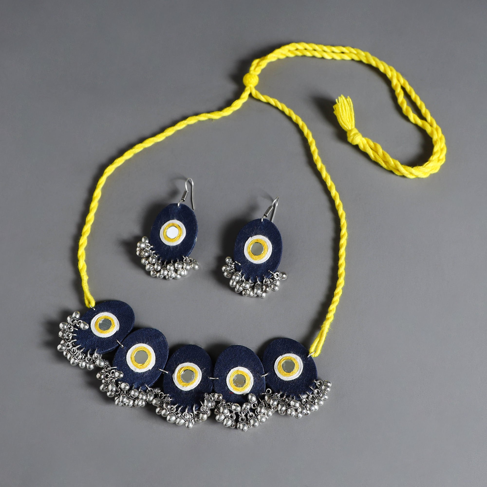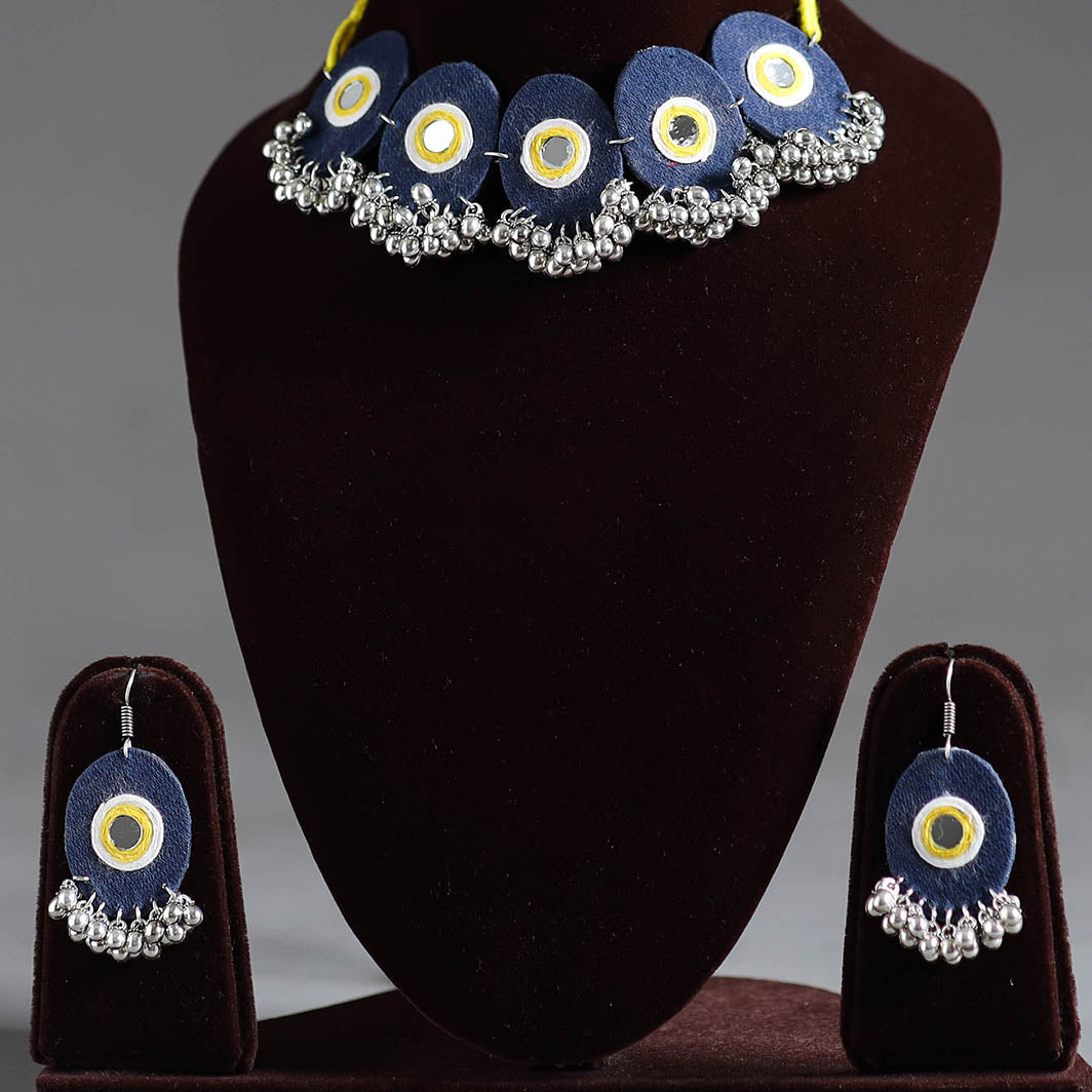 Add a touch of tradition to your jewellery with the blue fabart german silver mirror work choker necklace set. This exquisite piece is crafted from fabric, featuring detailed german silver, mirror and fine thread work that embodies the rich cultural heritage of Indian artisans.