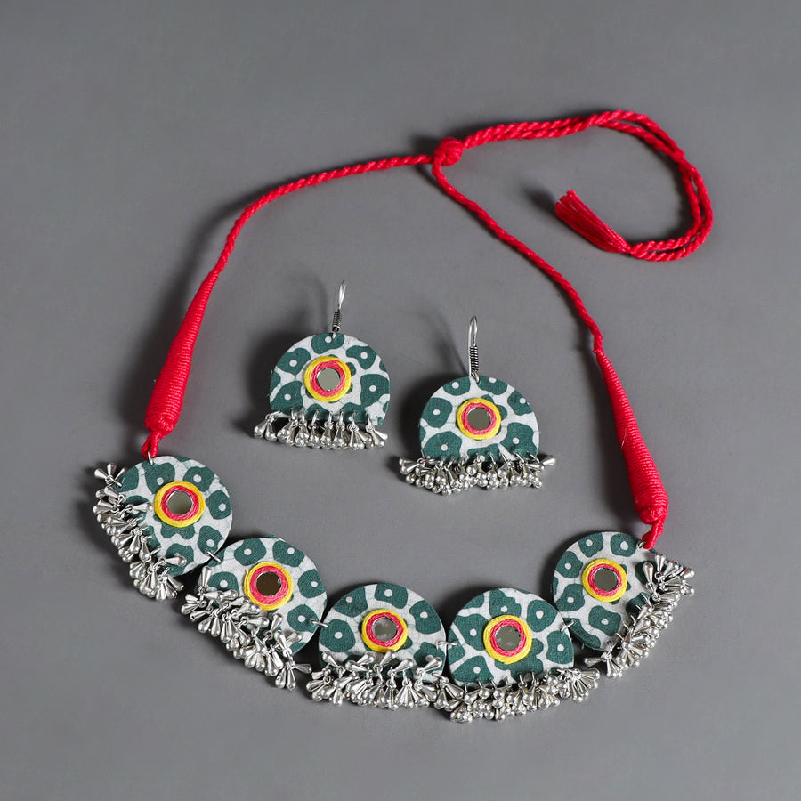 Add a touch of tradition to your jewellery with the green fabart german silver mirror work choker necklace set. This exquisite piece is crafted from fabric, featuring detailed german silver, mirror and fine thread work that embodies the rich cultural heritage of Indian artisans.
