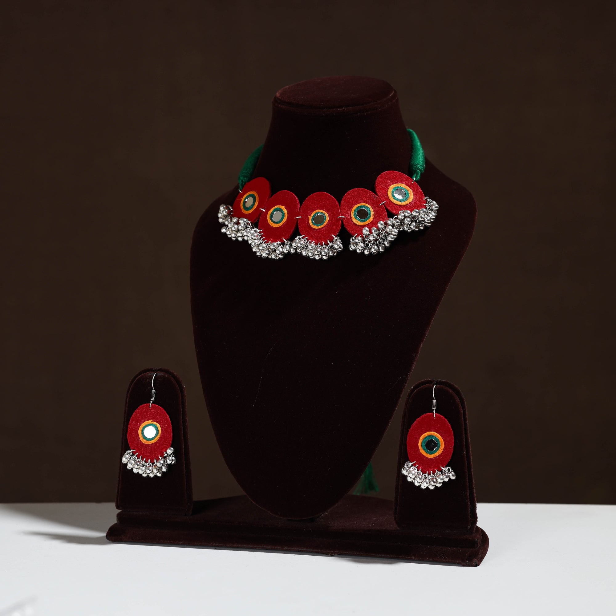 Add a touch of tradition to your jewellery with the red fabart german silver mirror work choker necklace set. This exquisite piece is crafted from fabric, featuring detailed german silver, mirror and fine thread work that embodies the rich cultural heritage of Indian artisans.