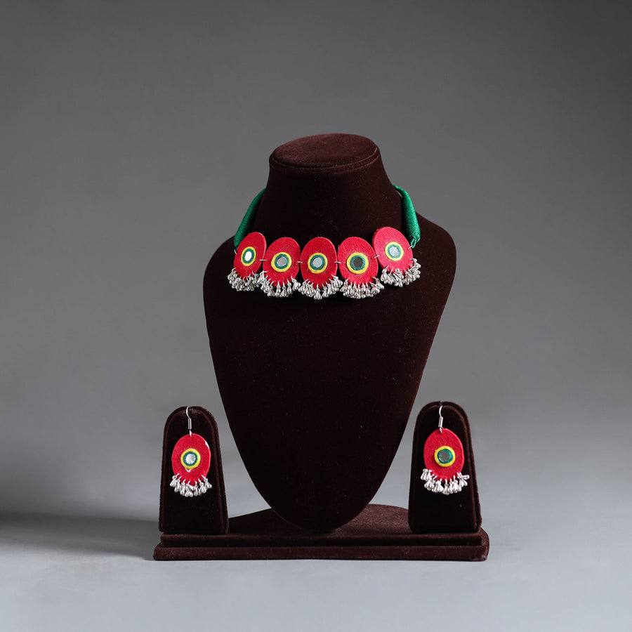 Red - Fabart German Silver Mirror Work Choker Necklace Set 08