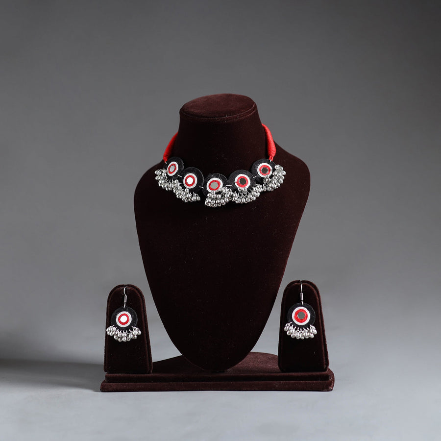 Add a touch of tradition to your jewellery with the black fabart german silver mirror work choker necklace set. This exquisite piece is crafted from fabric, featuring detailed german silver, mirror and fine thread work that embodies the rich cultural heritage of Indian artisans.