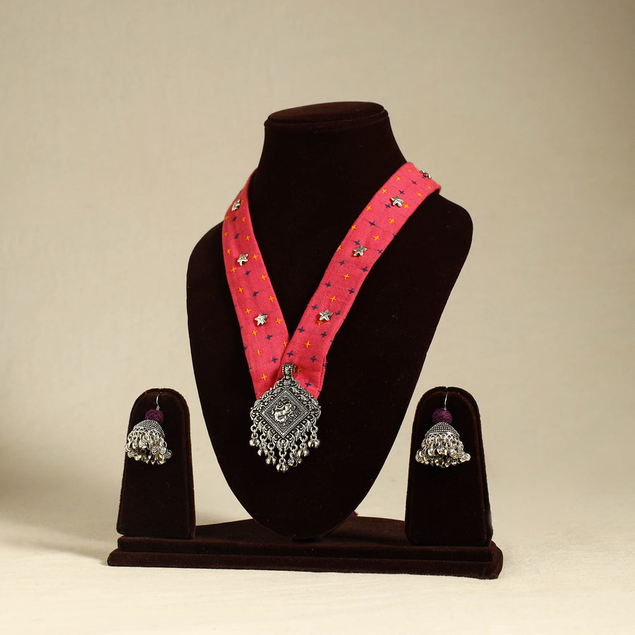 Elevate your ethnic charm with this red handcrafted fabric necklace set. Featuring a german silver pendant that brings an artistic flair, the necklace pairs beautifully