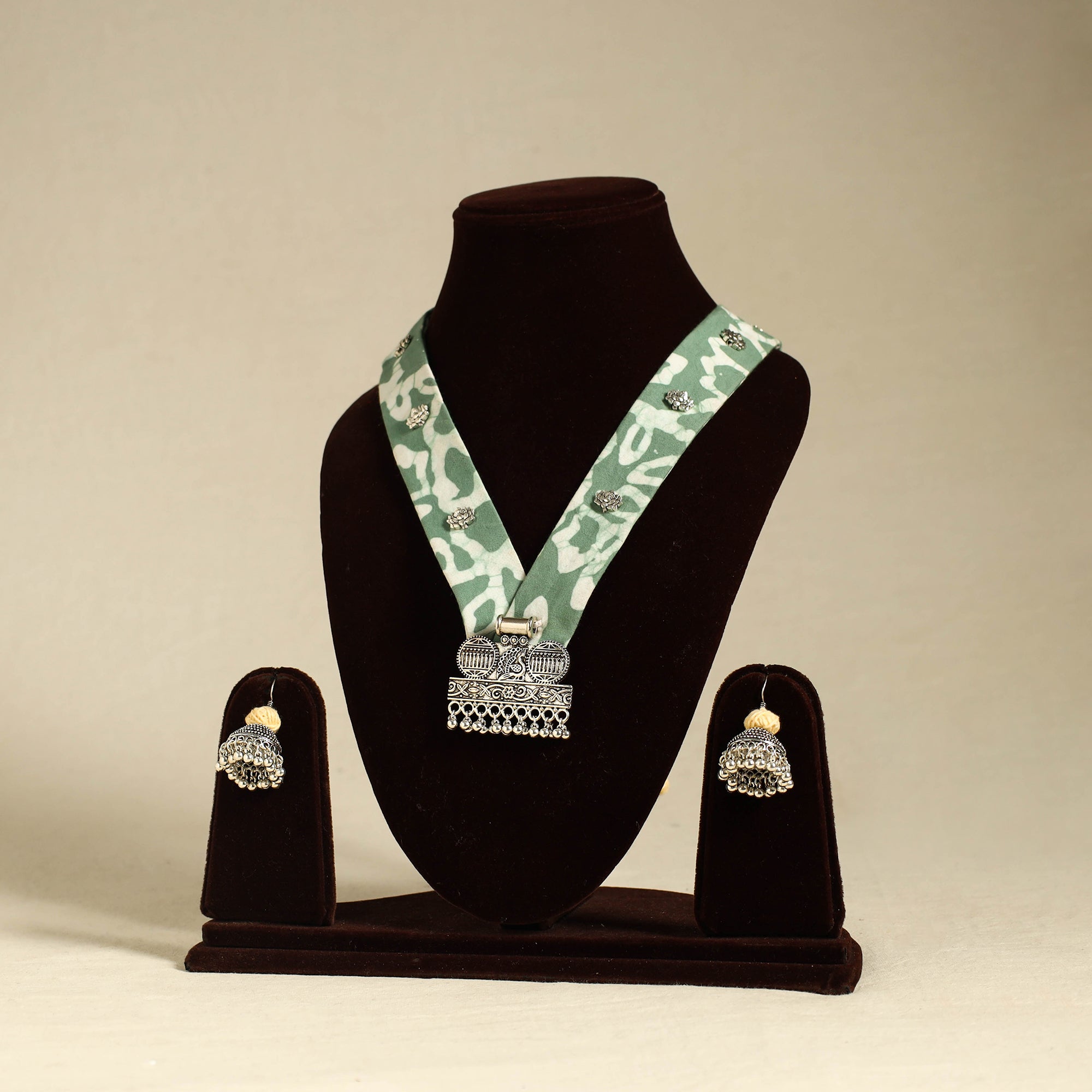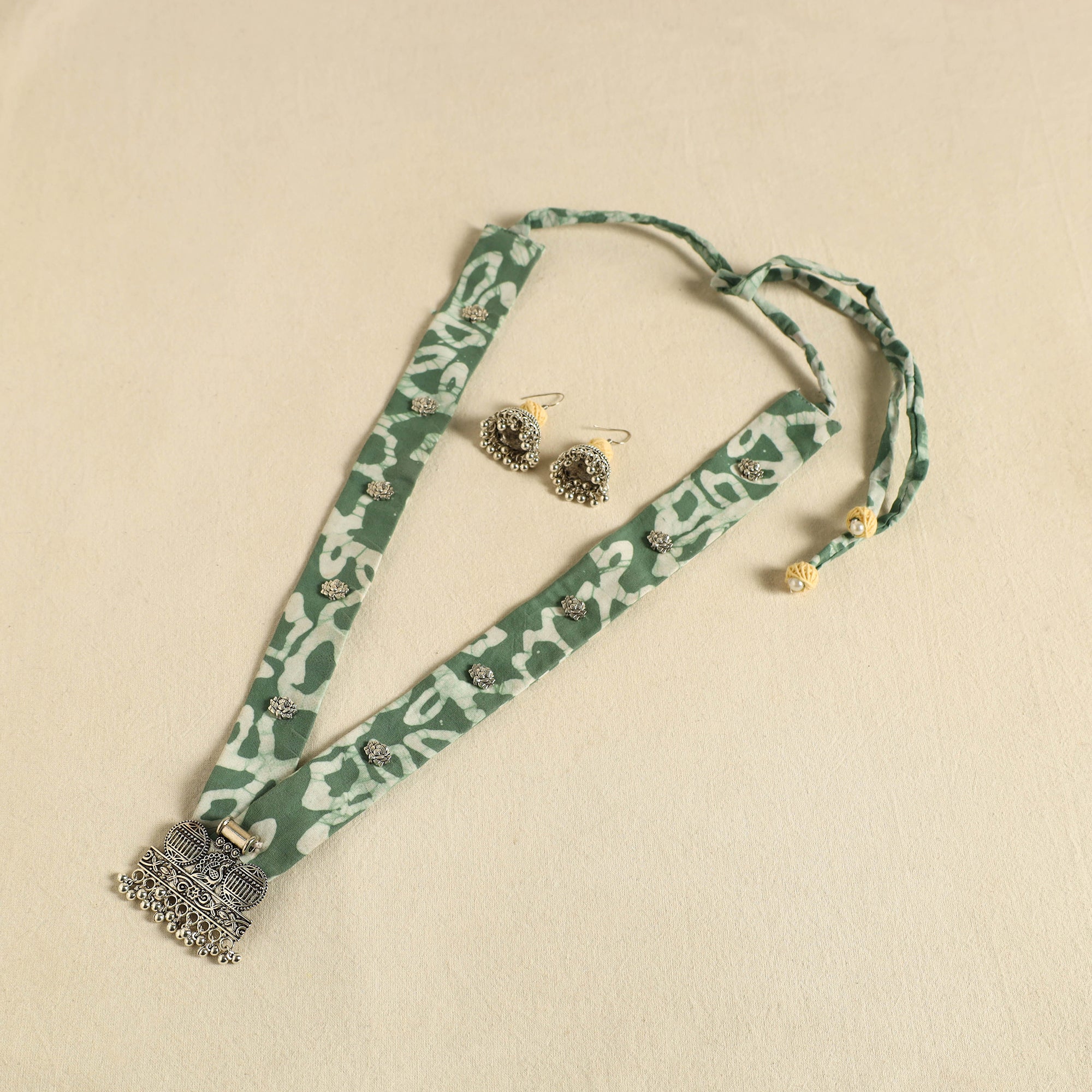 Elevate your ethnic charm with this green handcrafted fabric necklace set. Featuring a german silver pendant that brings an artistic flair, the necklace pairs beautifully