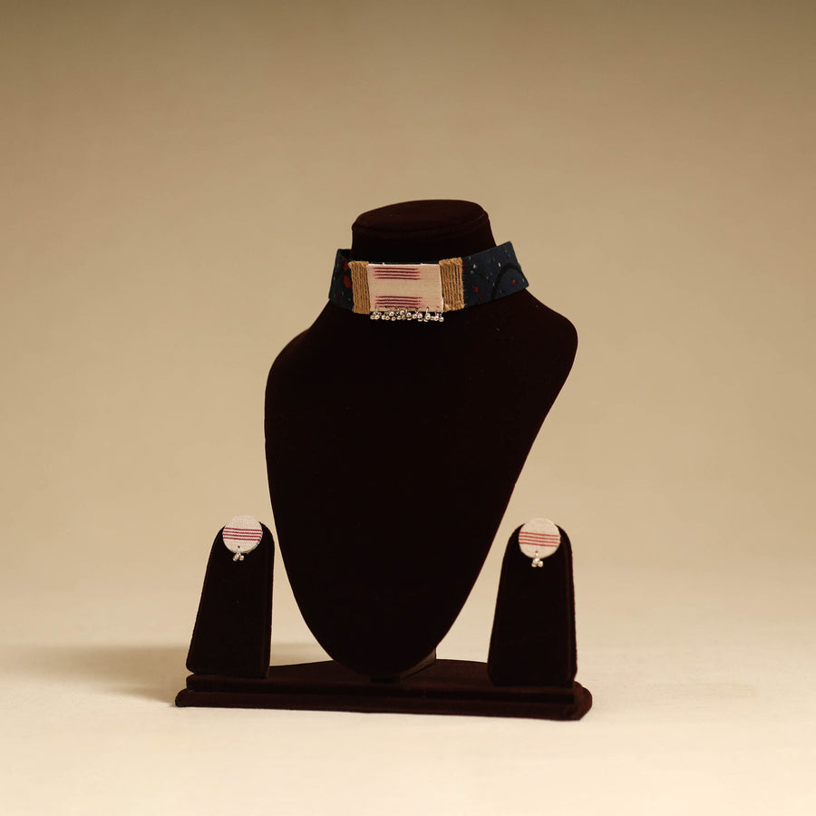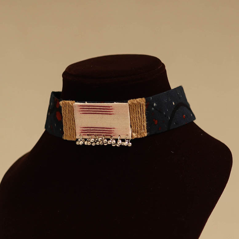 Enhance your style with this beige choker necklace set featuring a handcrafted fabric base adorned with jute accents and matching earrings. Perfect for both ethnic and modern outfits. The ghungroo detailing adds a hint of rustic charm, making it a true statement accessory.
