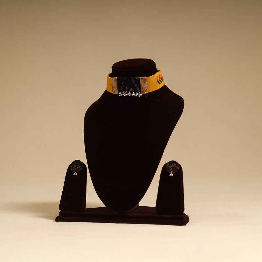 Enhance your style with this multicolor choker necklace set featuring a handcrafted fabric base adorned with jute accents and matching earrings. Perfect for both ethnic and modern outfits. The ghungroo detailing adds a hint of rustic charm, making it a true statement accessory.
