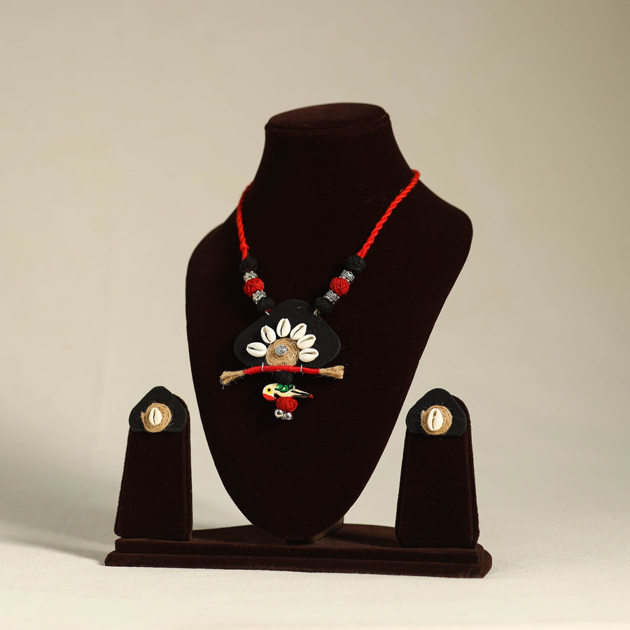 Complete your ethnic style with this black handmade fabric necklace set. Designed with a soft thread necklace, a vibrant fabric pendant, and matching earrings, it features delicate jute and shell accents, making it perfect for adding effortless elegance to any festive look.