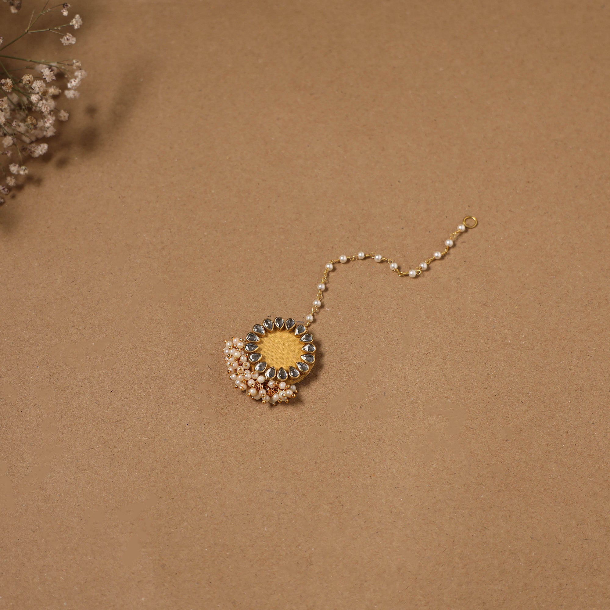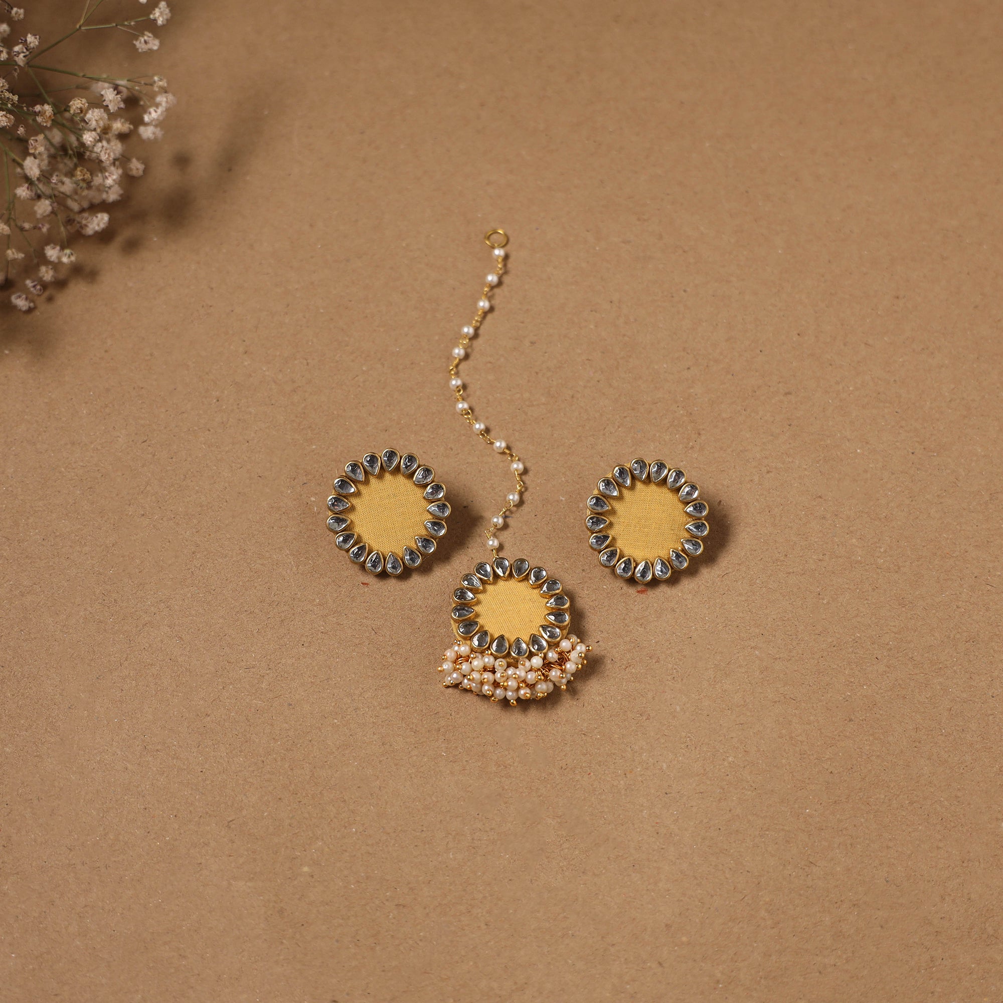 Handcrafted yellow fabart earrings with maang tikka set are beautifully detailed with kundan work and delicate beads. Made by women's artisans, this lightweight set is perfect for adding a traditional charm to haldi, mehendi, weddings and occasions.