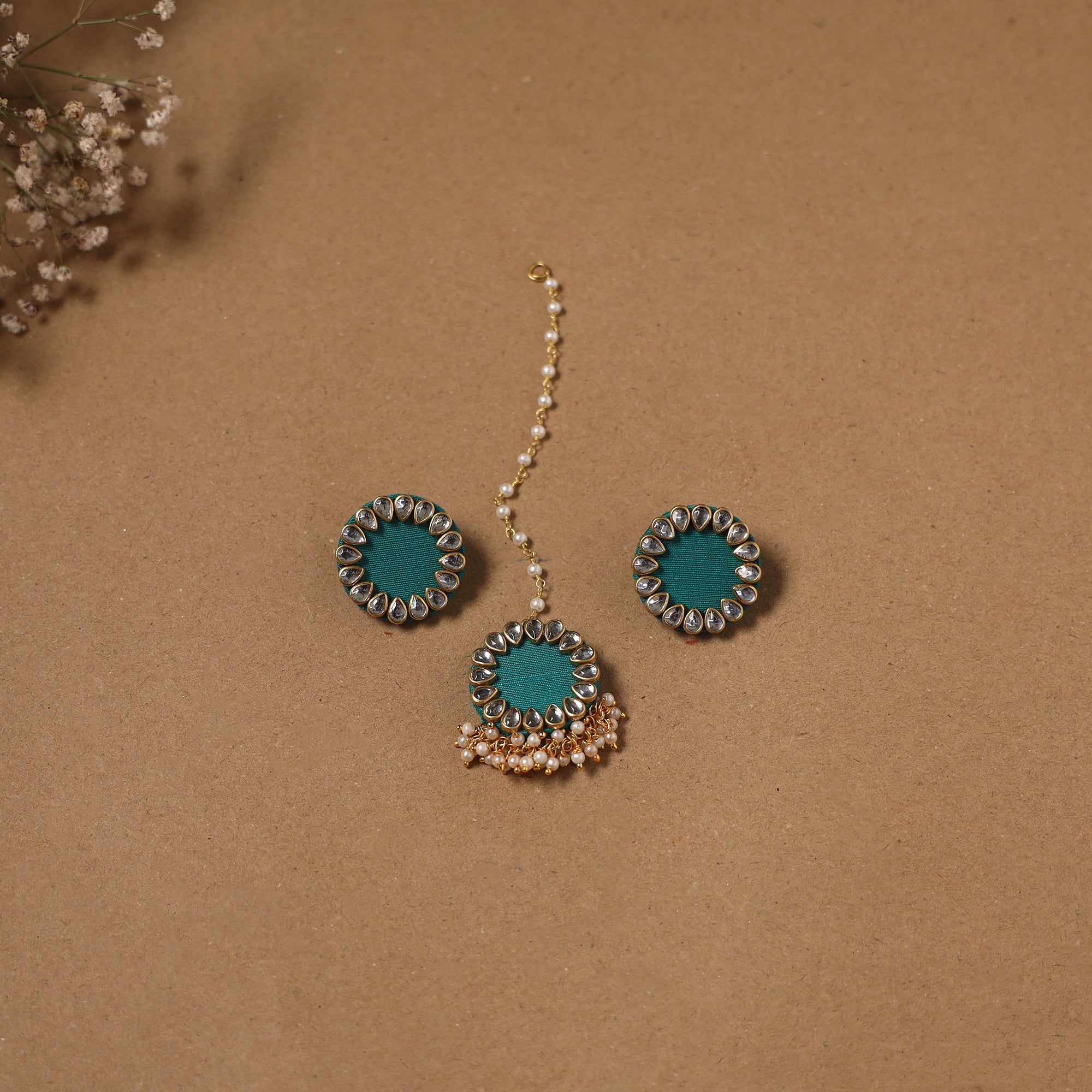 Handcrafted green fabart earrings with maang tikka set are beautifully detailed with kundan work and delicate beads. Made by women's artisans, this lightweight set is perfect for adding a traditional charm to haldi, mehendi, weddings and occasions.