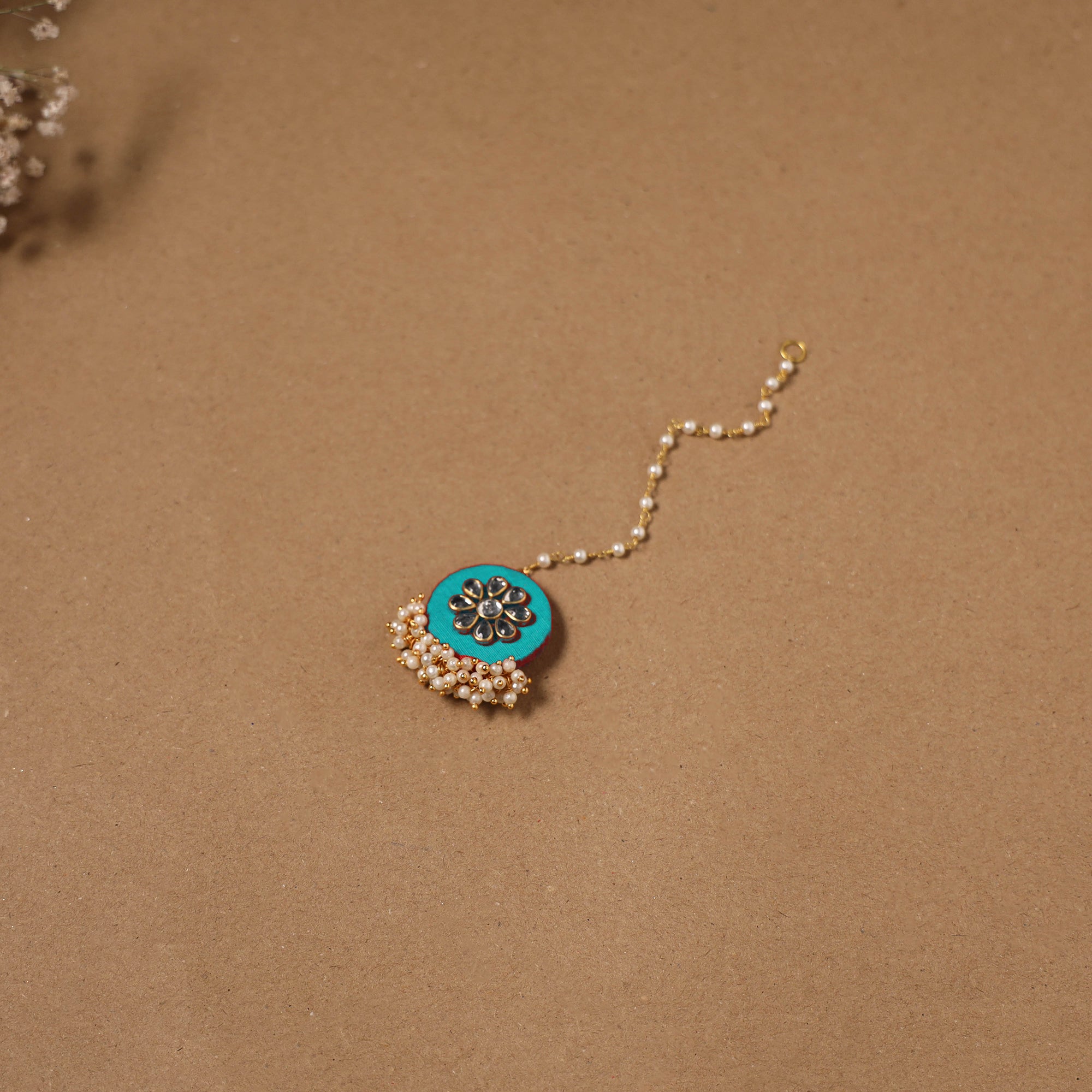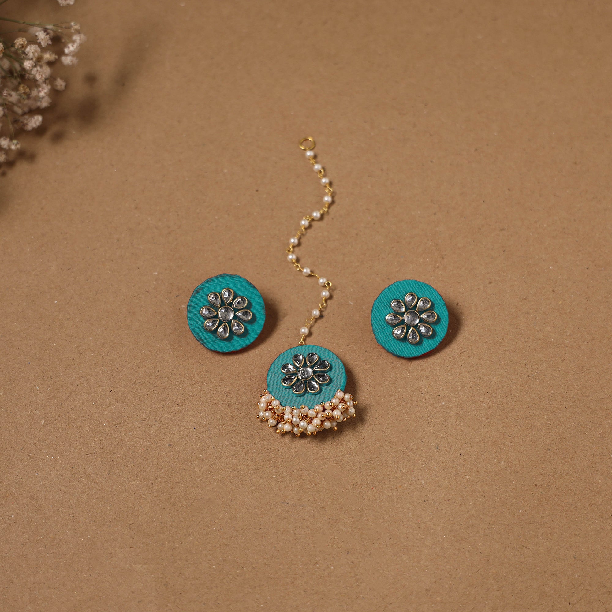 Handcrafted green fabart earrings with maang tikka set are beautifully detailed with kundan work and delicate beads. Made by women's artisans, this lightweight set is perfect for adding a traditional charm to haldi, mehendi, weddings and occasions.
