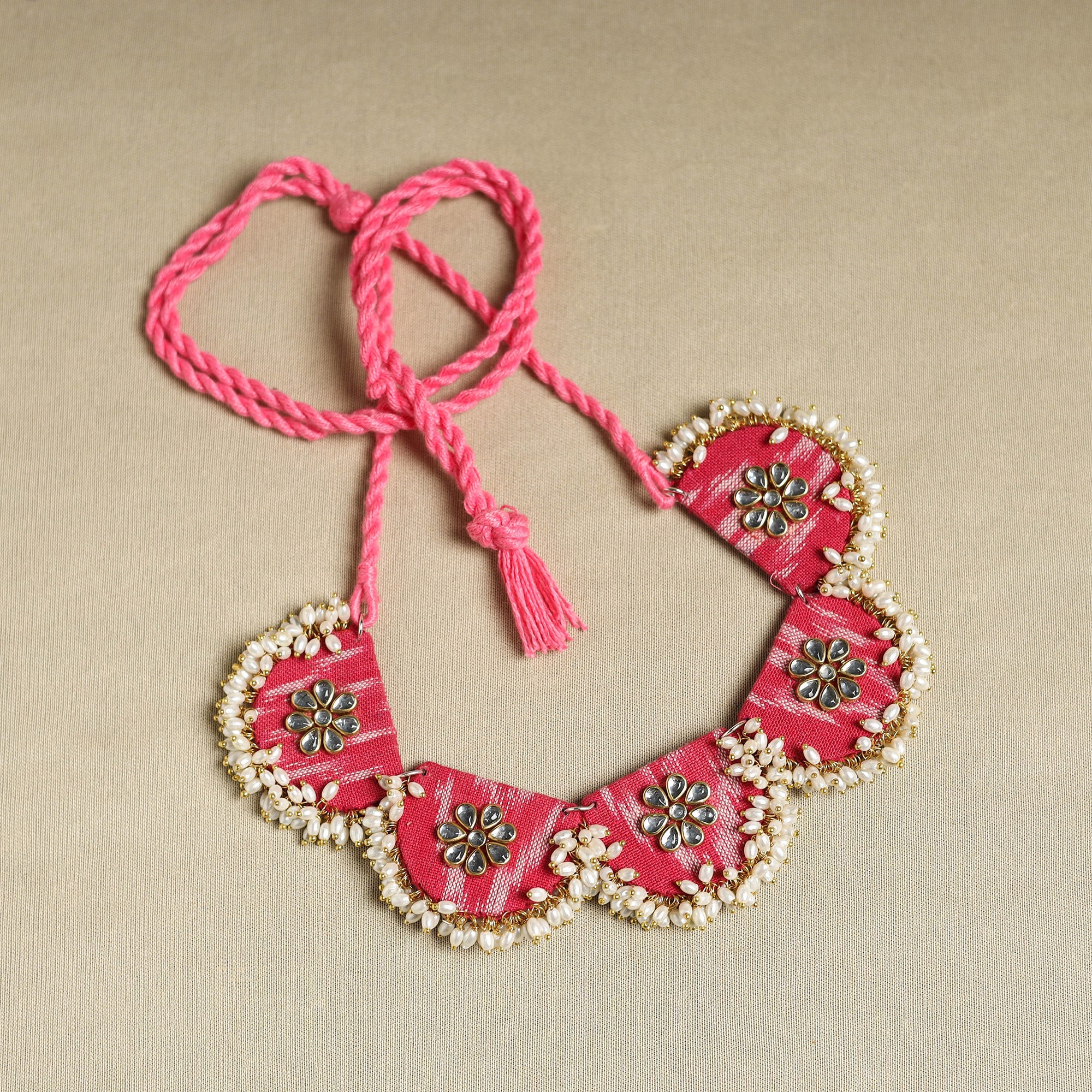 Complete your look with this handmade pink fabart necklace set. Made using thread, fabric, pearls, and stones, the set comes with matching earrings that also include german silver elements. Inspired by traditional jewellery styles, it features detailed craftsmanship that works well with festive wear or casual outfits.