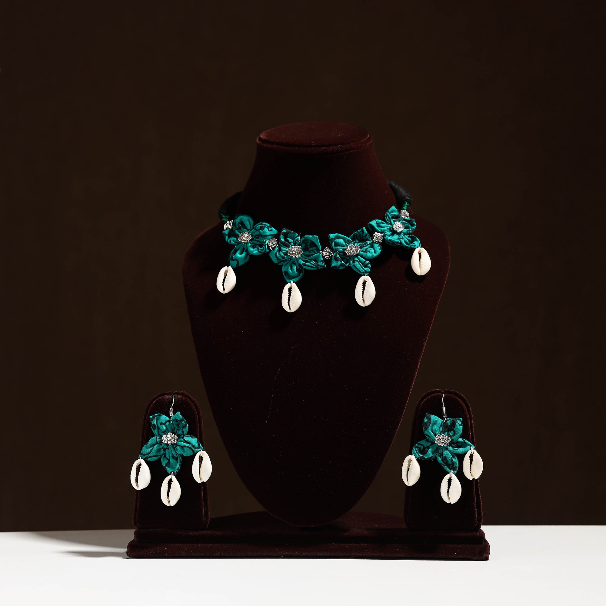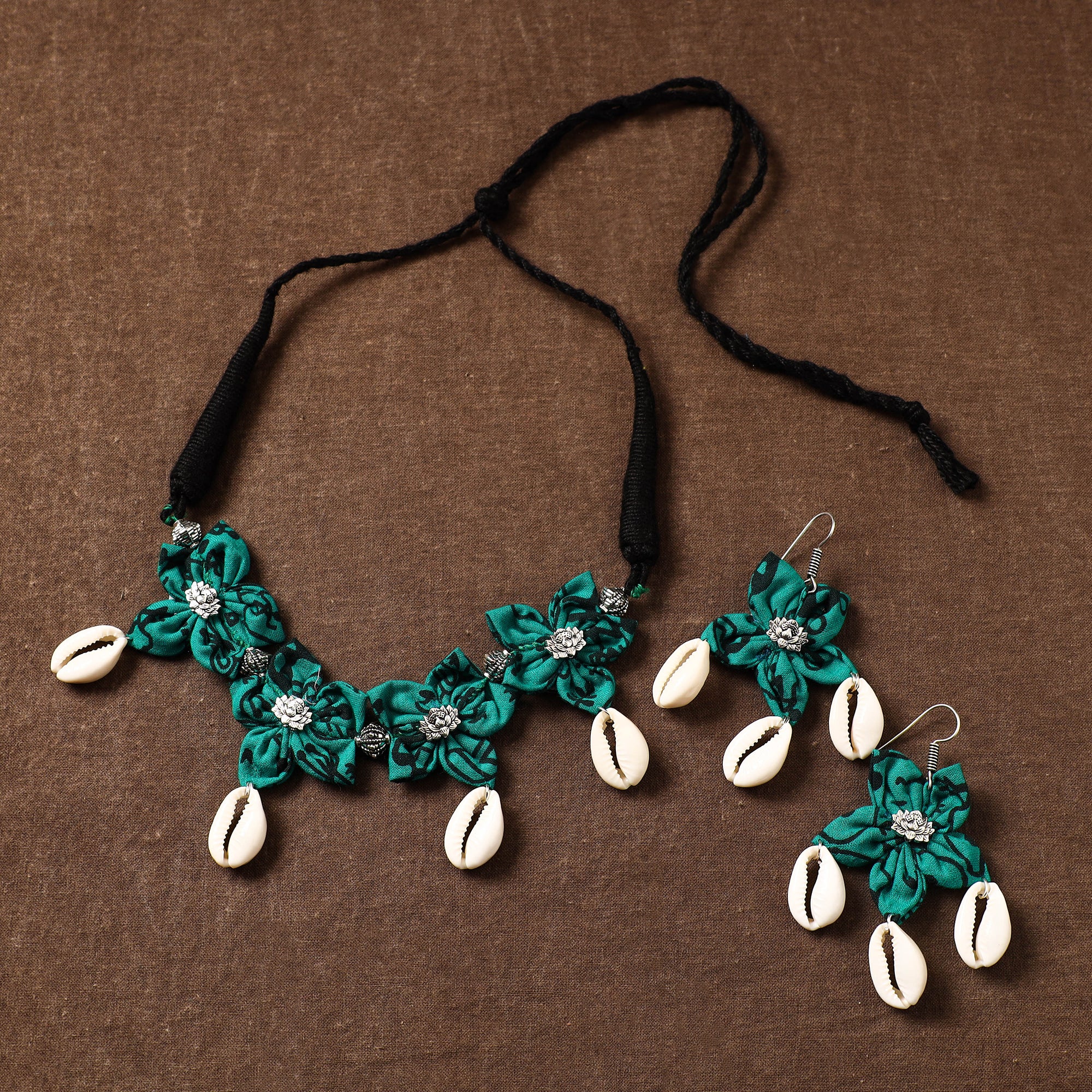 This is a green handcrafted fabart phool kali shell choker necklace set for women. Crafted by Indian artisans, this necklace set features intricate fabric designs combined with shells. Perfect for both casual and festive occasions.