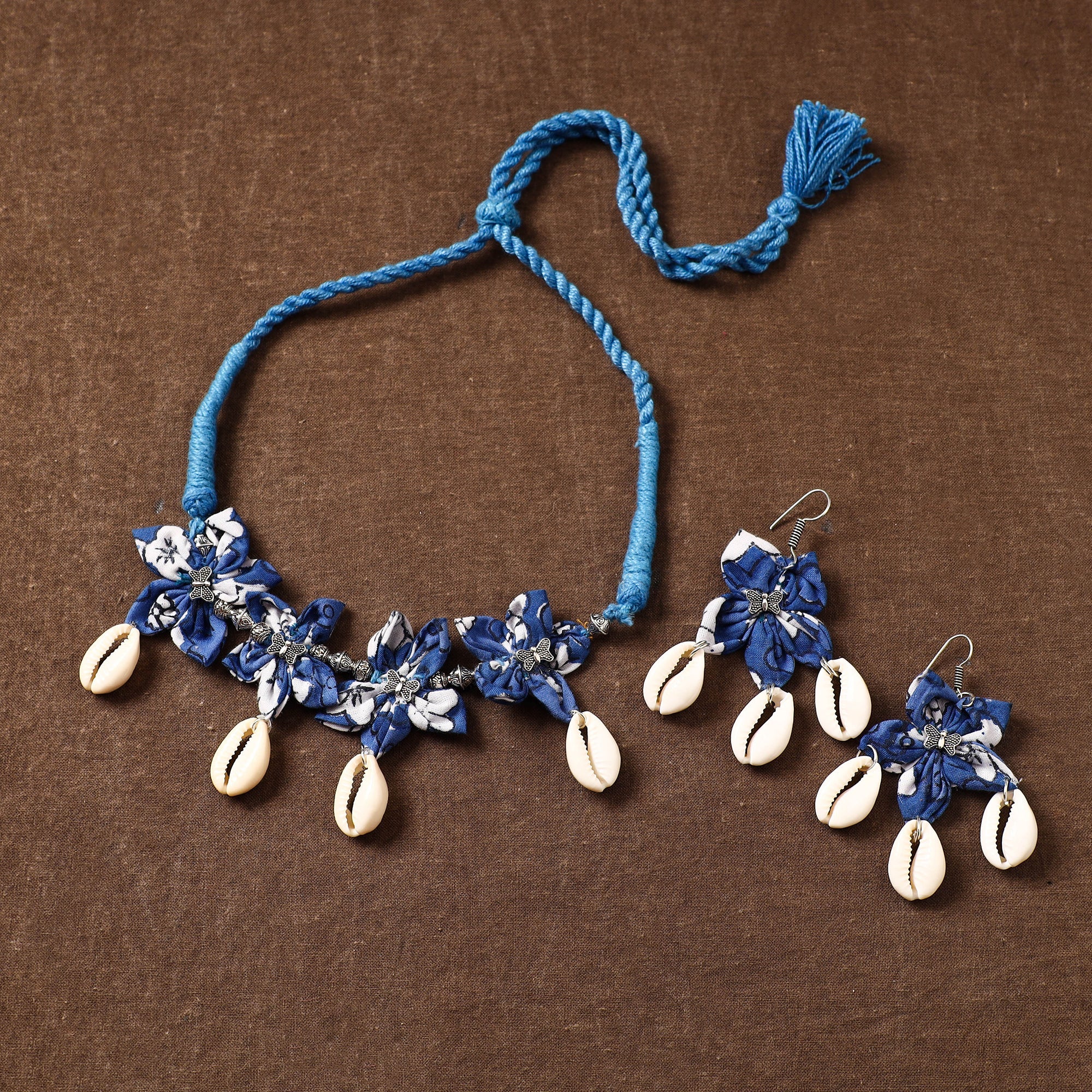 This is a blue handcrafted fabart phool kali shell choker necklace set for women. Crafted by Indian artisans, this necklace set features intricate fabric designs combined with shells. Perfect for both casual and festive occasions.