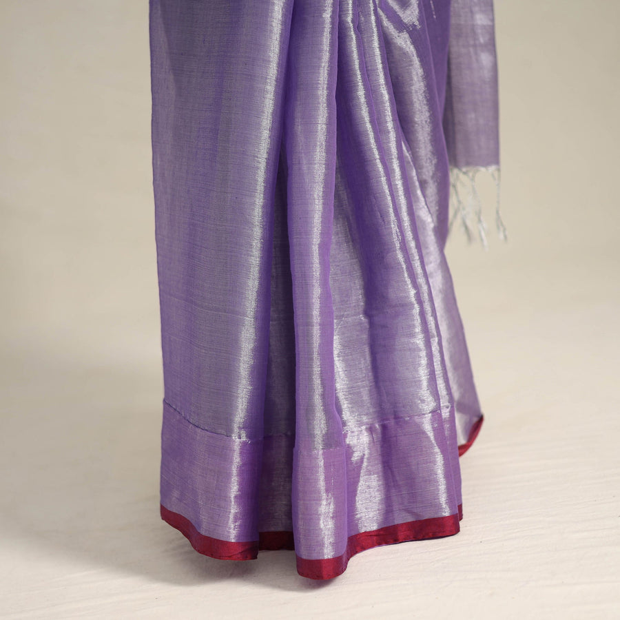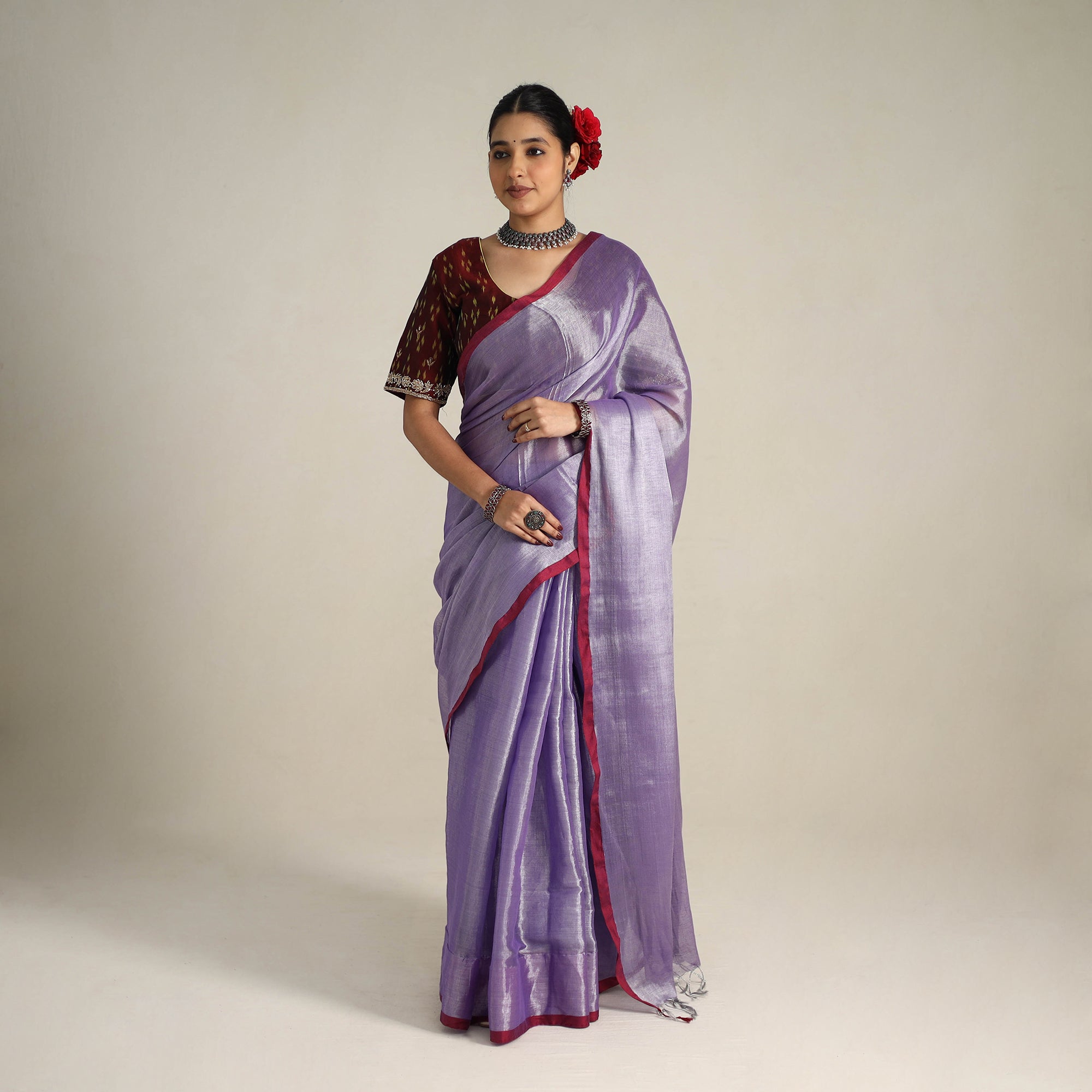 Fine cotton tissue zari purple bengal saree with hand embroidered blouse, designed for style and comfort, a symbol of Bengal's rich cultural heritage. This saree embodies the artistry of skilled artisans who preserve centuries old traditions. The tissue zari fabric adds a attractive touch while the matching mercerised cotton pochampally ikat embroidered blouse completes the ensemble