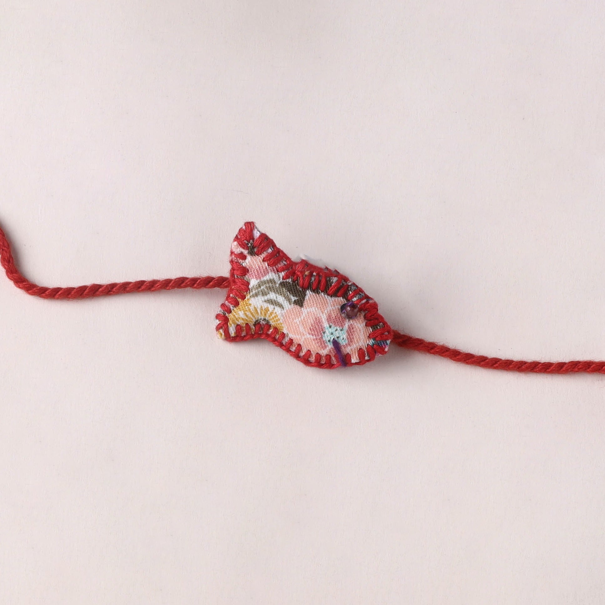 Upcycled fabric kids rakhi with thread embroidery and bead work, crafted by Jan Sandesh.
