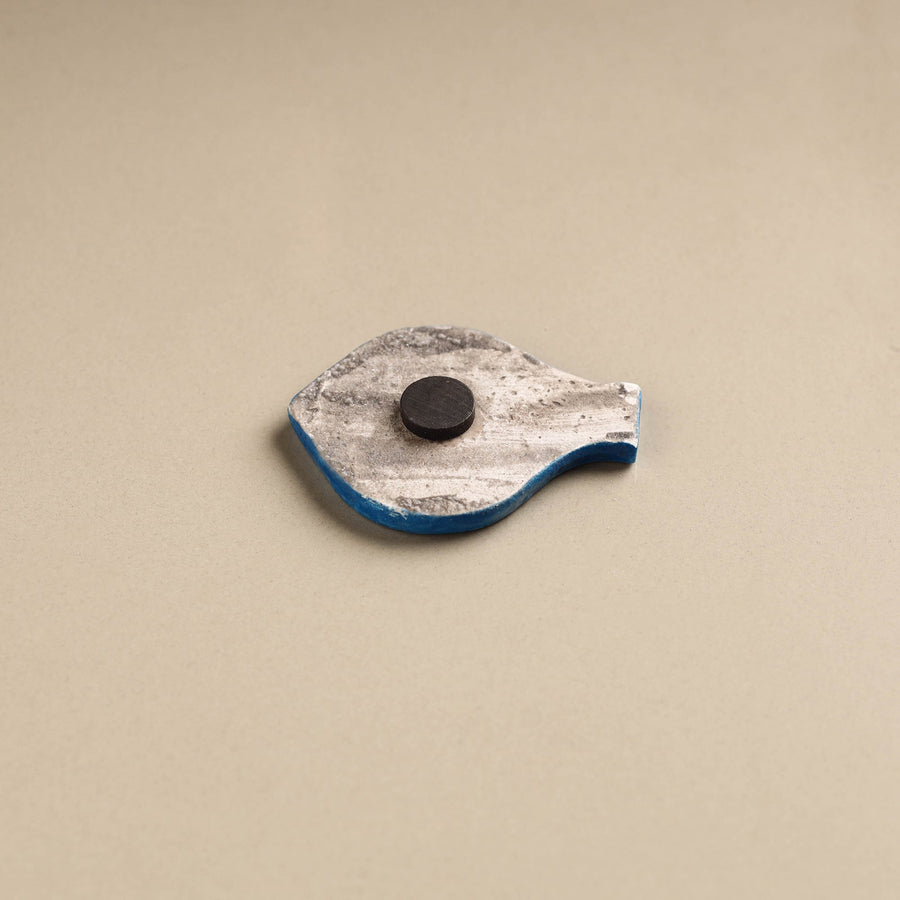 This original blue pottery ceramic tile blue fish fridge magnet is handmade in Jaipur. This traditional craft, known for its vivid blue hues, is created using a unique clay-free mixture of quartz stone powder, powdered glass, Multani Mitti (Fuller's Earth), borax, gum and water. Blue pottery is widely recognized as a traditional craft of Jaipur, though it is Turko-Persian in origin. This magnet is perfect for home decor or gifting.
