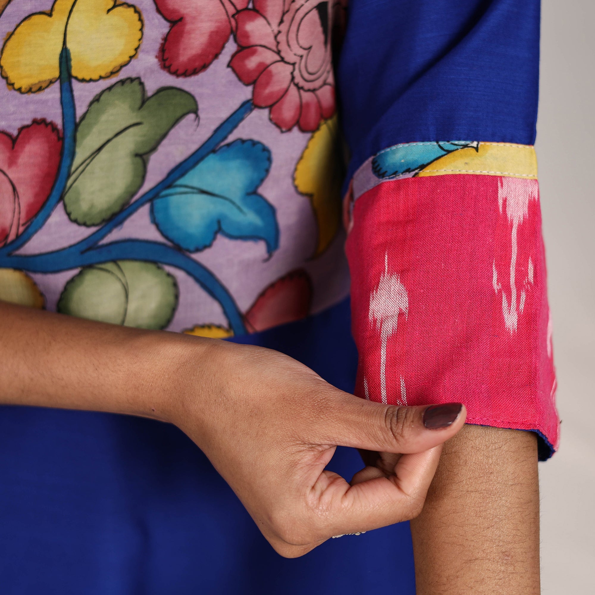 Embrace tradition with the blue slub silk straight plain kurta with patchwork, featuring intricate kalamkari and Ikat patchwork. Crafted from slub silk, it offers comfort and style. With a handy one-side pocket, this kurta is perfect for both casual and festive occasions, adding a touch of elegance to your wardrobe.